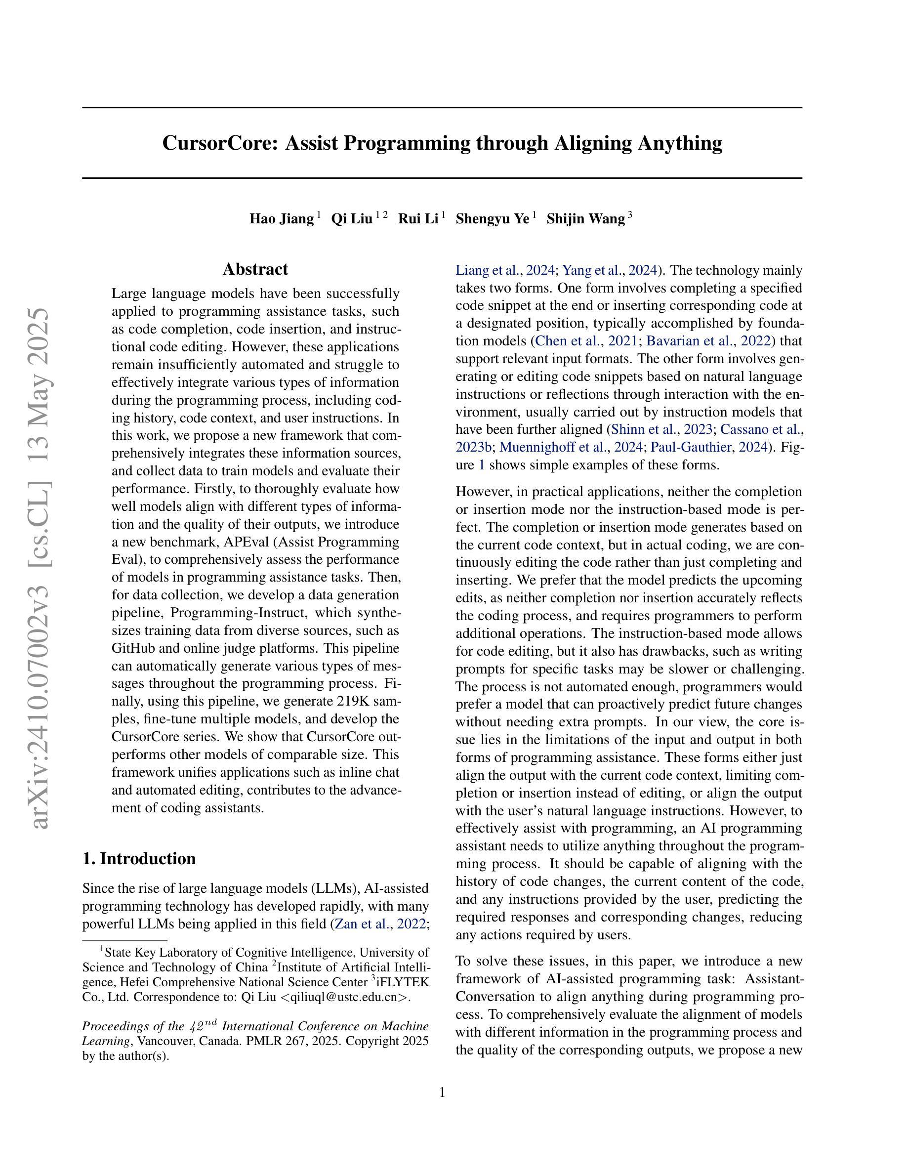 Summary:大型语言模型在编程辅助任务中表现出良好的应用前景,但仍面临自动化程度不足和难以整合多种信息的问题。本研究提出了一种新的对话框架,旨在全面整合编程过程中的各种信息,并引入新的评估标准和数据生成管道来训练和评估模型。最终开发的CursorCore系列模型在编程辅助任务上表现出优异性能,统一了即时聊天和自动编辑等应用。