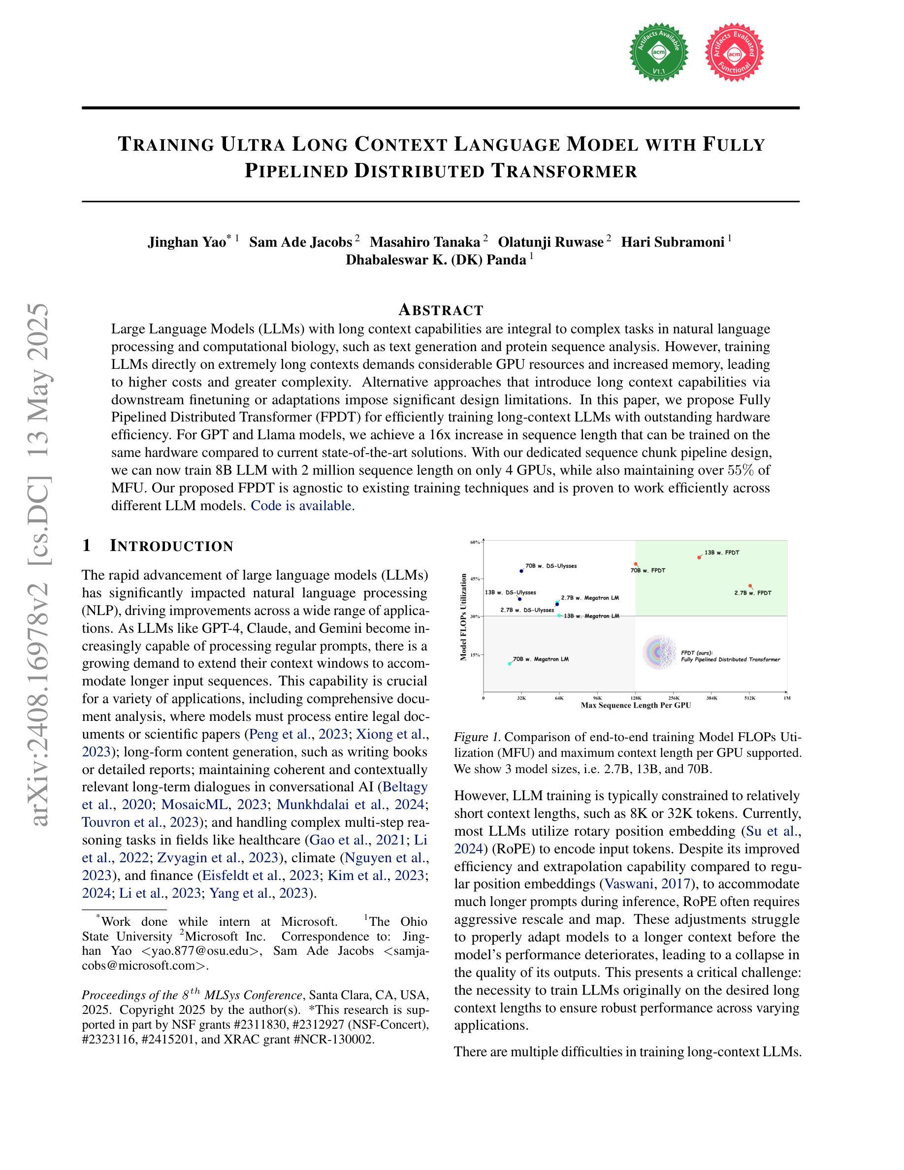 - 当前研究中提出了一种名为Fully Pipelined Distributed Transformer(FPDT)的新方法来解决这个问题,通过专门的序列块流水线设计提高了训练大型语言模型的效率。这一方法在保持高硬件效率的同时实现了对超长序列的训练能力增长。此外,该方法对现有的训练技术具有中立性,能够在不同的LLM模型中有效运行。