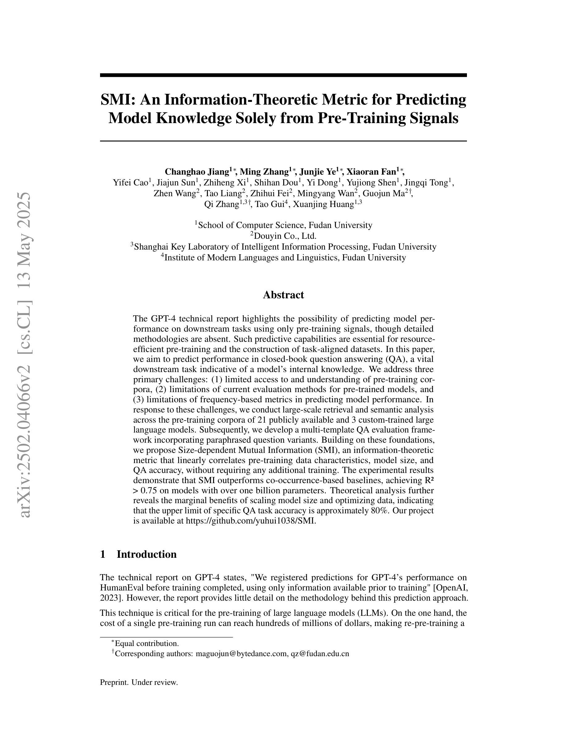 The GPT-4 technical report highlights the possibility of predicting model performance on downstream tasks using only pre-training signals, though detailed methodologies are absent. Such predictive capabilities are essential for resource-efficient pre-training and the construction of task-aligned datasets. In this paper, we aim to predict performance in closed-book question answering (QA), a vital downstream task indicative of a model’s internal knowledge. We address three primary challenges: (1) limited access to and understanding of pre-training corpora, (2) limitations of current evaluation methods for pre-trained models, and (3) limitations of frequency-based metrics in predicting model performance. In response to these challenges, we conduct large-scale retrieval and semantic analysis across the pre-training corpora of 21 publicly available and 3 custom-trained large language models. Subsequently, we develop a multi-template QA evaluation framework incorporating paraphrased question variants. Building on these foundations, we propose Size-dependent Mutual Information (SMI), an information-theoretic metric that linearly correlates pre-training data characteristics, model size, and QA accuracy, without requiring any additional training. The experimental results demonstrate that SMI outperforms co-occurrence-based baselines, achieving $R^2$ > 0.75 on models with over one billion parameters. Theoretical analysis further reveals the marginal benefits of scaling model size and optimizing data, indicating that the upper limit of specific QA task accuracy is approximately 80%. Our project is available at https://github.com/yuhui1038/SMI.
