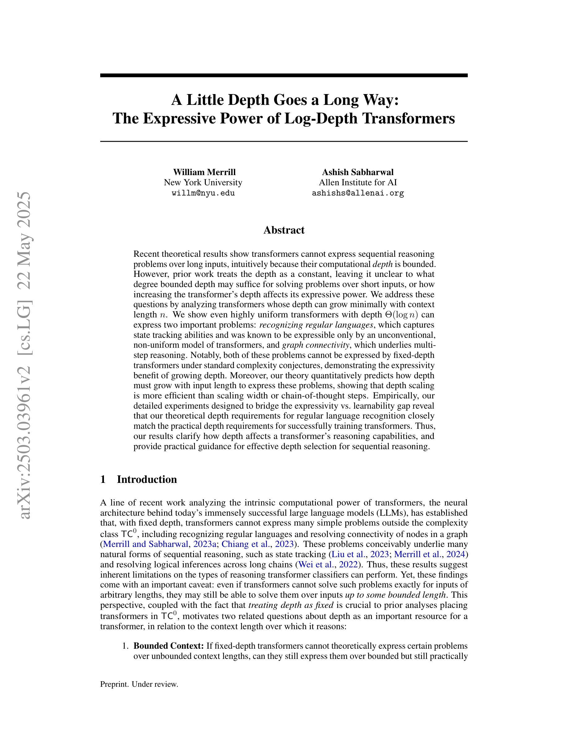 本文探讨了变压器的深度对其解决长输入序列推理问题的影响。研究表明,即使对于深度为O(logn)的均匀变压器,也能表达两种重要问题:识别正则语言和图形连接问题。这表明增加深度有助于提高变压器的表达能力,而且理论预测深度随输入长度的增长方式比宽度或思维链步骤更有效。实验表明,理论深度要求与成功训练变压器的实际深度要求相匹配。因此,本文明确了深度对变压器推理能力的影响,为实际选择有效深度提供了指导。