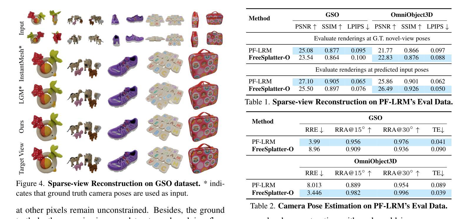 - FreeSplatter在实际挑战中超越了某些大型重建模型(LRMs),在姿态估计方面也有良好的表现。