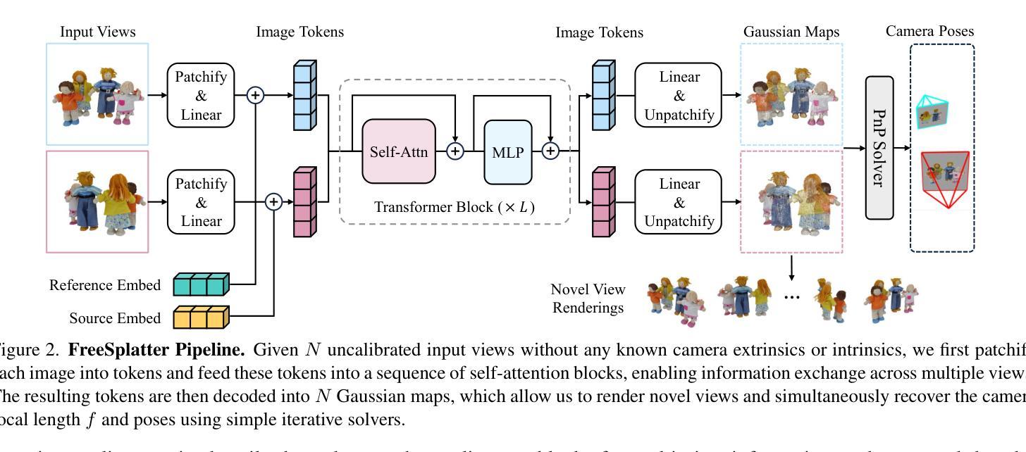 - FreeSplatter可以同时进行高保真三维建模和高效的相机参数估计。