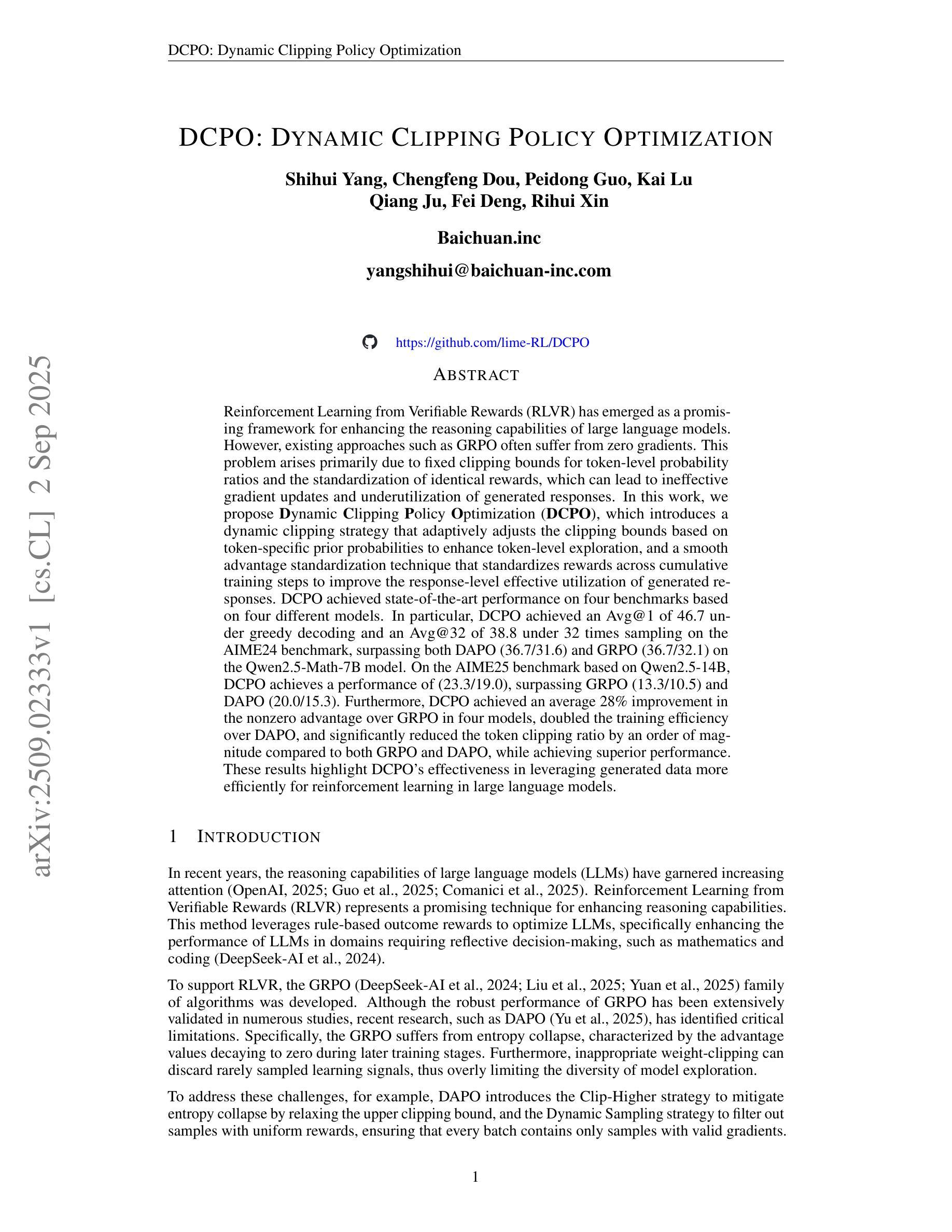 Reinforcement Learning from Verifiable Rewards (RLVR) has emerged as a promising framework for enhancing the reasoning capabilities of large language models. However, existing approaches such as GRPO often suffer from zero gradients. This problem arises primarily due to fixed clipping bounds for token-level probability ratios and the standardization of identical rewards, which can lead to ineffective gradient updates and underutilization of generated responses. In this work, we propose Dynamic Clipping Policy Optimization (DCPO), which introduces a dynamic clipping strategy that adaptively adjusts the clipping bounds based on token-specific prior probabilities to enhance token-level exploration, and a smooth advantage standardization technique that standardizes rewards across cumulative training steps to improve the response-level effective utilization of generated responses. DCPO achieved state-of-the-art performance on four benchmarks based on four different models. In particular, DCPO achieved an Avg@1 of 46.7 under greedy decoding and an Avg@32 of 38.8 under 32 times sampling on the AIME24 benchmark, surpassing both DAPO (36.7/31.6) and GRPO (36.7/32.1) on the Qwen2.5-Math-7B model. On the AIME25 benchmark based on Qwen2.5-14B, DCPO achieves a performance of (23.3/19.0), surpassing GRPO (13.3/10.5) and DAPO (20.0/15.3). Furthermore, DCPO achieved an average 28% improvement in the nonzero advantage over GRPO in four models, doubled the training efficiency over DAPO, and significantly reduced the token clipping ratio by an order of magnitude compared to both GRPO and DAPO, while achieving superior performance. These results highlight DCPO’s effectiveness in leveraging generated data more efficiently for reinforcement learning in large language models.