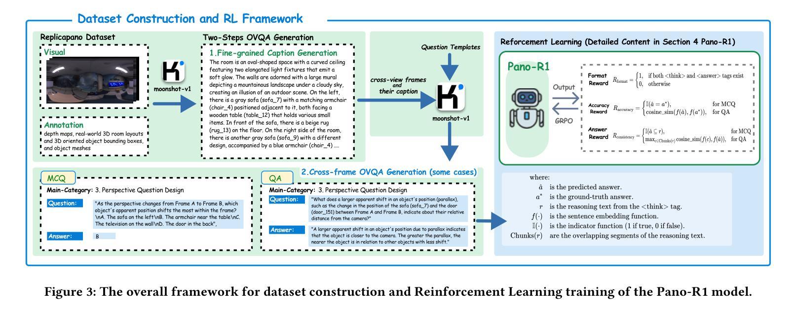 - 提出了一种多模态大型语言模型方法,采用GRPO和定制奖励函数进行跨帧相关全景的稳健推理。