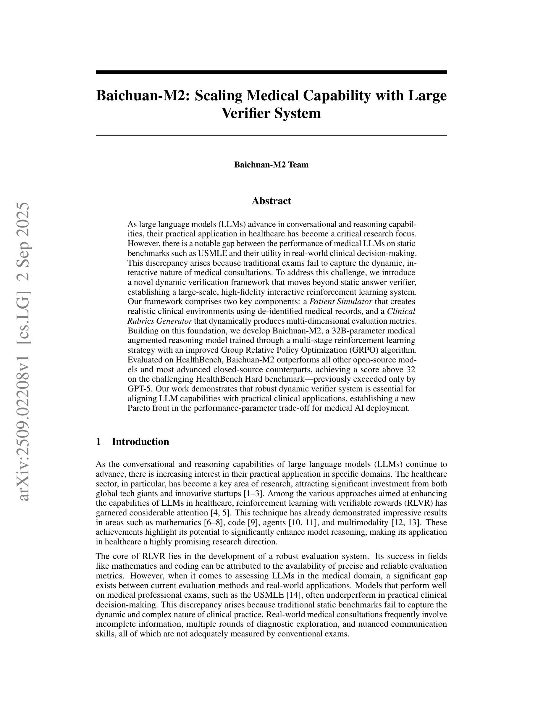 随着大型语言模型(LLM)在对话和推理能力方面的不断进步,它们在医疗保健领域的实际应用已成为重要的研究焦点。然而,在诸如USMLE等静态基准测试上表现良好的医疗LLM,在现实世界中的临床决策制定中的实用性却存在显著差距。这种差异的产生是因为传统考试无法捕捉到医疗咨询的动态交互性质。为了解决这一挑战,我们引入了一种新型动态验证框架,该框架超越了静态答案验证器,建立了一个大规模、高保真度的交互式强化学习系统。我们的框架包括两个关键组成部分:使用去标识医疗记录创建现实临床环境的病人模拟器,以及动态生成多维度评价指标的临床规则生成器。在此基础上,我们开发了白川M2,这是一个32B参数的医疗增强推理模型,通过多阶段强化学习策略进行训练,并改进了群体相对策略优化(GRPO)算法。在HealthBench上评估,白川M2超越了所有其他开源模型和最先进的专有模型,在具有挑战性的HealthBench Hard基准测试上得分超过32分(之前只有GPT-5才能达到)。我们的工作表明,健壮的动态验证系统对于将LLM能力与实际临床应用相结合至关重要,为医疗人工智能部署的性能参数权衡建立了新的帕累托前沿。