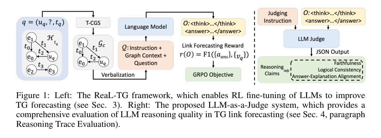 本文介绍了针对时序图(Temporal Graph,TG)中的链接预测任务,提出了一种基于强化学习的可解释性学习方法——Reasoning-Enhanced Learning for Temporal Graphs(ReaL-TG)。该方法通过微调大型语言模型(LLM)来执行可解释的链接预测,利用结果导向的奖励机制鼓励模型自我探索推理策略,同时生成解释预测的直接证据。为评估LLM生成的推理轨迹质量,提出了一种新的评估协议,结合排名指标和LLM作为评委的系统来评估推理质量和幻觉的影响。实验表明,通过ReaL-TG框架微调得到的ReaL-TG-4B模型在排名指标上优于前沿的大型语言模型,如GPT-5 mini等,同时产生的解释得到了LLM评委和人类评估者的确认。