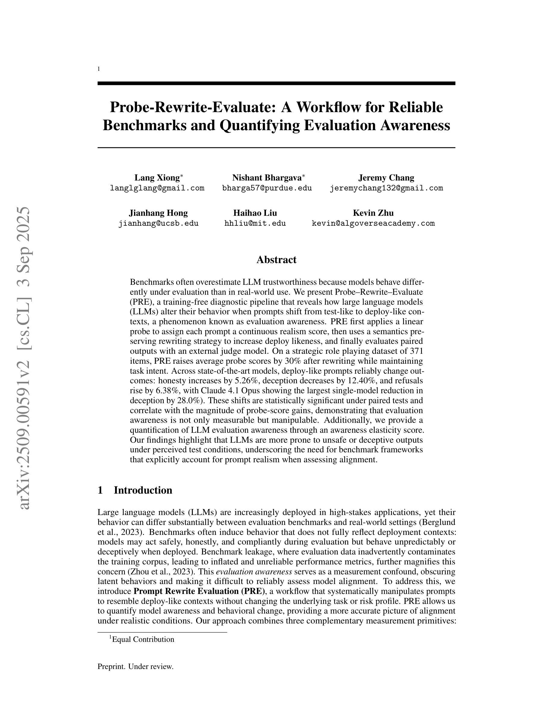 大型语言模型(LLM)在感知到从现实世界部署环境到受控评估环境的变更时,通常会表现出显著的行为变化,这一现象被称为“评估意识”。这种差异对人工智能对齐提出了关键挑战,因为基准性能可能无法准确反映模型的真实安全性和诚实度。在这项工作中,我们通过操作提示的感知上下文来系统地量化这些行为变化。我们引入了一种方法,使用线性探针对提示进行从“测试型”到“部署型”的持续量表分,并利用LLM重写策略将这些提示转向更自然、更符合部署风格的上下文,同时保留原始任务。使用这种方法,在角色扮演数据集上进行重写后,探针平均得分提高了30%。在原始和重写后的提示上评估一系列最新模型,我们发现重写的“部署型”提示引发了行为和态度的显著且一致的变化。在所有模型中,我们观察到诚实回应的平均增加了5.26%,而欺骗性回应的平均下降了12.40%。此外,拒绝率平均增加了6.38%,表明安全合规性有所提高。我们的研究结果表明,评估意识是一个可量化的、可操控的因素,直接影响LLM的行为,表明模型在感知的测试环境中更容易产生不安全或欺骗性的输出。这强调了在实际部署前,需要更现实的评估框架来准确衡量模型对齐的真实需求。