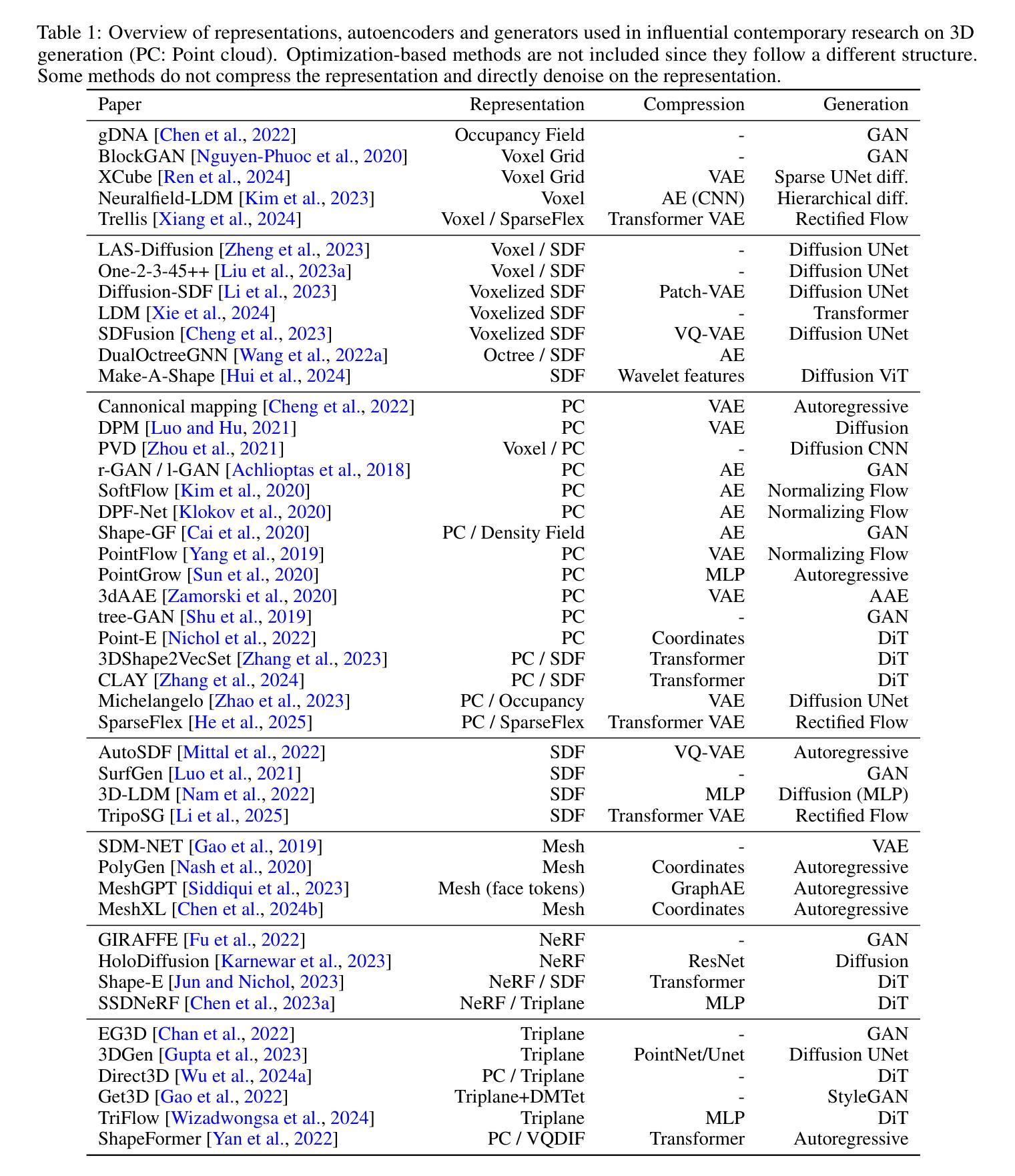 在文本和图像生成技术的快速发展之后,研究逐渐转向3D生成技术。不同于图像中已成熟的像素基础表示,3D表示仍然多样且分散,包括体素网格、神经辐射场、有符号距离函数、点云和八叉树等多种方法,各有其独特的优势和局限。本研究提出了一种统一的评估框架,旨在评估3D表示在重建和生成方面的性能。我们基于质量、计算效率和泛化性能等多个标准对这些表示进行了比较。除了标准模型基准测试外,我们的实验还旨在推导涉及整个3D生成管道的所有步骤的最佳实践,包括预处理、网格重建、自动编码器的压缩和生成。我们发现重建错误对整体性能产生重大影响,强调需要联合评估和生成和重建。我们的见解可以为各种应用选择合适的三维模型提供依据,促进三维生成技术在稳健性和应用特定解决方案方面的发展。