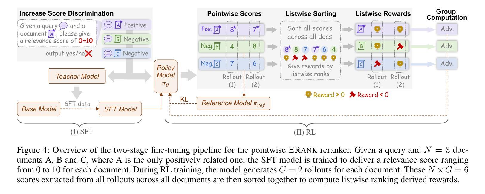 文本重排模型是现代检索增强生成系统中的重要组成部分,负责在生成前选择最相关的文档。然而,当前的大型语言模型驱动的重新排名器常常面临一个基本的权衡。一方面,基于监督微调(Supervised Fine-Tuning)的点态方法将相关性作为二分类任务来处理,缺乏必要的评分判别力,特别是对于基于推理的大型语言模型。另一方面,针对复杂推理的方法通常采用强大但低效的列表式公式,使得它们不适用于低延迟应用。为了解决这一困境,我们引入了ERank,这是一个高效且高效的点态重新排名器,由擅长处理各种相关性场景的大型语言模型构建而成。我们提出了一种新颖的两阶段训练管道,首先从监督微调(SFT)开始。在这一阶段,我们超越了二元标签的限制,以生成方式训练模型以输出精细粒度的整数分数,这显著提高了相关性的判别力。然后进一步使用强化学习(RL)进行细化调整模型参数与行为特征选取设置决策模式或准则修正评分函数,并使用一种新型的列表式派生奖励。这种技术将全局排名意识灌输到高效的点态架构中。我们在BRIGHT、FollowIR、TREC DL和BEIR基准测试集上对ERank重新排名器进行了评估证明了它在先进的方法和任务目标上所表现得更出色强大且具有鲁棒性对于需要强烈逻辑推理能力的bright基准测试数据集我们的ERank-4B模型实现了nDCG@10为38.7的得分而更大的32B变体则达到了业界领先的nDCG@10为40.2的得分表现卓越在重推理任务的基准测试中优势明显领先于业界其他模型。