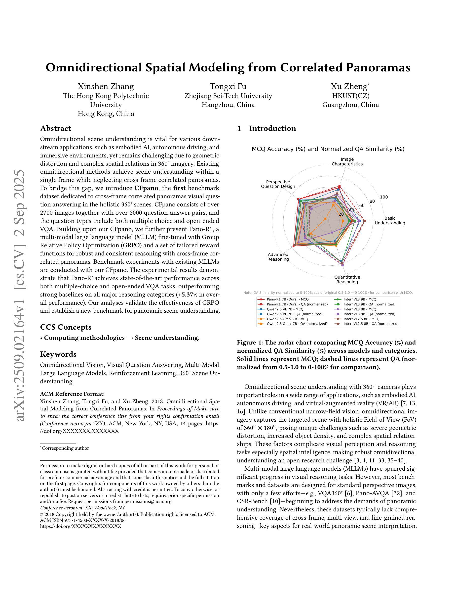 全景场景理解对于各种下游应用(如嵌入式人工智能、自动驾驶和沉浸式环境)至关重要,然而由于360度图像中的几何失真和复杂的空间关系,它仍然是一个挑战。现有的全景方法在同一帧内实现场景理解,但忽略了跨帧相关全景图。为了填补这一空白,我们引入了CFpano,这是首个专门针对全景场景中跨帧相关全景图的视觉问答的基准数据集。CFpano包含超过2700张图像和超过8000个问答对,问题类型包括多项选择和开放式问答。基于我们的CFpano,我们进一步推出了\methodname,这是一种多模态大型语言模型(MLLM),采用群体相对策略优化(GRPO)和一系列定制的奖励函数进行微调,以实现跨帧相关全景图的稳健和一致推理。我们在CFpano基准数据集上与现有的MLLM进行了实验。实验结果表明,\methodname在多项选择和开放式问答任务中都达到了最新技术水平,在所有主要推理类别上都超过了强大的基准线(总体性能提高\textbf{5.37%})。我们的分析验证了GRPO的有效性,并为全景场景理解建立了新的基准。