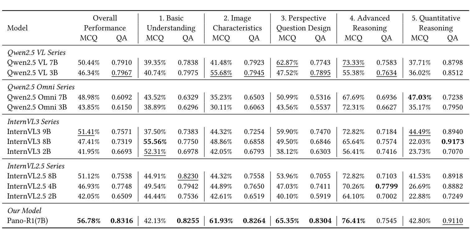 本文介绍了全景场景理解的重要性及其面临的挑战,如几何失真和复杂的空间关系。为了解决这个问题,提出了一种新的基准数据集CFpano,专门用于全景场景中的跨帧相关全景视觉问答任务。该数据集包含超过2700张图像和超过8000个问答对,包括多种类型的问题。基于CFpano数据集,进一步提出了一种多模态大型语言模型(MLLM)的方法,采用群体相对策略优化(GRPO)和定制奖励函数进行微调,实现跨帧相关全景的稳健和一致推理。实验结果表明,该方法在多项选择题和开放性问题解答任务上均达到最佳性能,在主要推理类别上优于强基线。