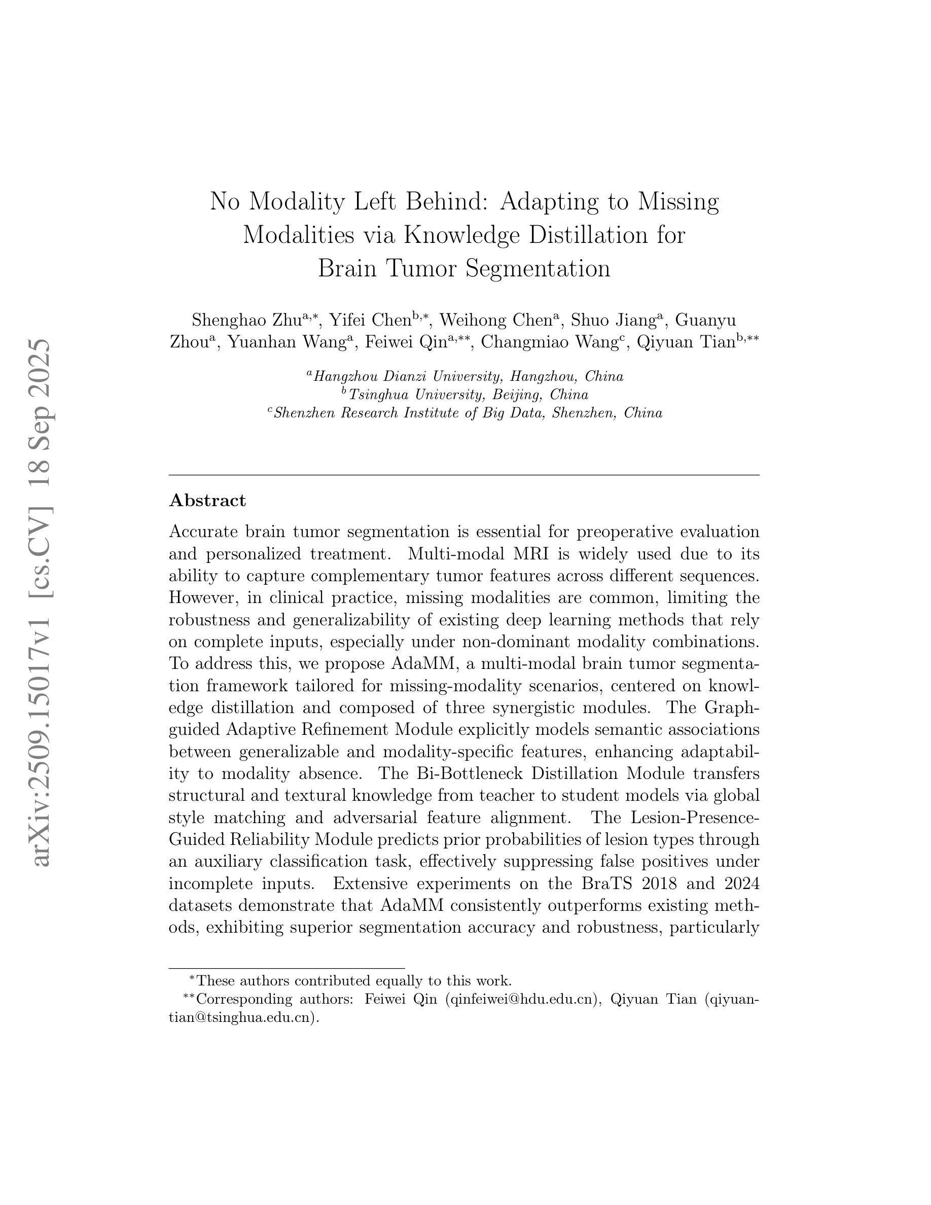 精确的脑肿瘤分割对于术前评估和个性化治疗至关重要。多模态MRI由于其能够在不同序列中捕获互补的肿瘤特征而得到广泛应用。然而,在临床实践中,缺失模态的情况很常见,这限制了依赖完整输入的现有深度学习方法的稳健性和通用性,特别是在非主导模态组合下。为了解决这一问题,我们提出了AdaMM,这是一个针对缺失模态场景的多模态脑肿瘤分割框架,以知识蒸馏为中心,由三个协同模块组成。图引导自适应细化模块显式建模通用特征和模态特定特征之间的语义关联,增强了适应模态缺失的能力。双瓶颈蒸馏模块通过全局风格匹配和对抗性特征对齐,将教师和学生的模型之间的结构和纹理知识进行了传递。病灶存在引导可靠性模块通过辅助分类任务预测病灶类型的先验概率,有效地抑制了不完全输入下的误报。在BraTS 2018和2024数据集上的大量实验表明,AdaMM始终优于现有方法,表现出更高的分割精度和稳健性,特别是在单模态和弱模态配置下。此外,我们对六类缺失模态策略进行了系统评估,证实了知识蒸馏的优越性,并为方法选择和未来研究提供了实际指导。我们的源代码可在https://github.com/Quanato607/AdaMM上找到。