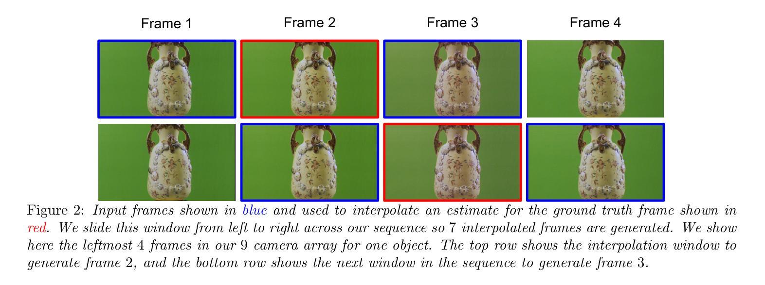关于图像序列中的帧合成方法存在许多,但大致可归纳为帧插值和视图合成技术。从根本上讲,帧插值和视图合成解决的是同一任务,即在给定时间或空间周围的帧的情况下进行帧插值。然而,大多数帧插值数据集侧重于单相机在时间、空间中的运动方面的时序方面,而视图合成数据集通常偏向于立体深度估计的应用场景。这使得视图合成和帧插值方法之间的直接比较具有挑战性。在本文中,我们使用自定义构建的密集线性相机阵列开发了一个新型的多相机数据集,以实现这些方法之间的公平比较。我们评估了经典和深度学习的帧插值器与视图合成方法(高斯三维散斑)在中间视图任务上的表现。我们的结果表明,在真实图像数据上,深度学习方法并没有显著优于经典方法,高斯三维散斑实际上比帧插值器低达3.5分贝峰值信噪比(PSNR)。然而,在合成场景中情况恰恰相反——高斯三维散斑在95%的置信水平下,比帧插值算法高出近5分贝PSNR。