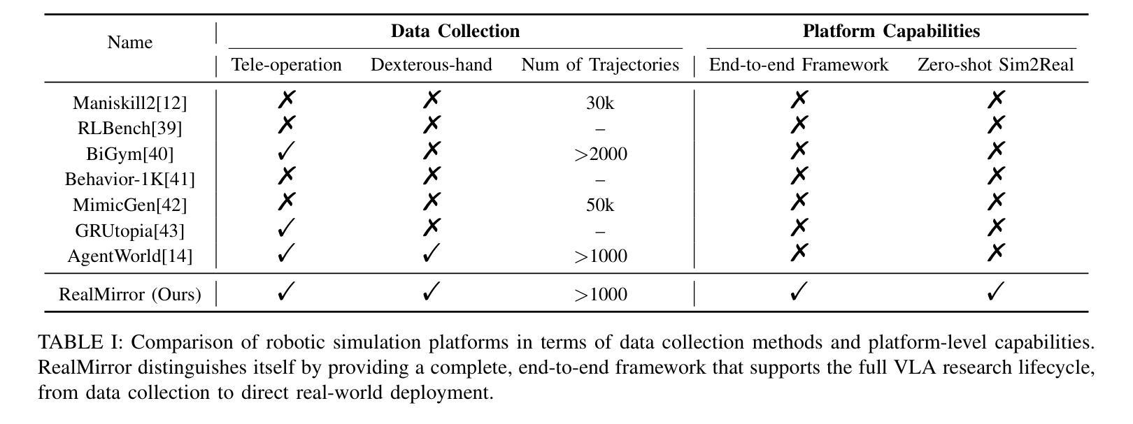 - RealMirror是一个针对人形机器人的视觉语言动作(VLA)的综合开源平台。
