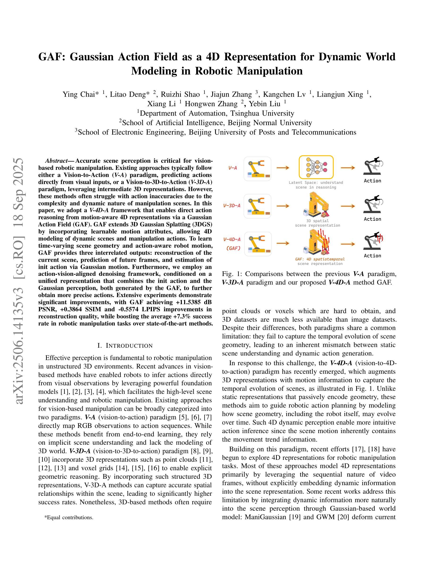 本文提出了一种基于V-4D-A框架的机器人操作技术,该技术通过高斯动作场(GAF)直接从运动感知的4D表示中进行动作推理。GAF扩展了3D高斯拼贴(3DGS),通过引入可学习的运动属性,实现对动态场景和操作动作的4D建模。此外,GAF还提供对当前场景的重建、未来帧的预测以及初始动作的估计等三个相关输出,并基于初始动作和由GAF生成的高斯感知条件构建了一个动作视觉对齐的去噪框架,从而更精确地获得动作。