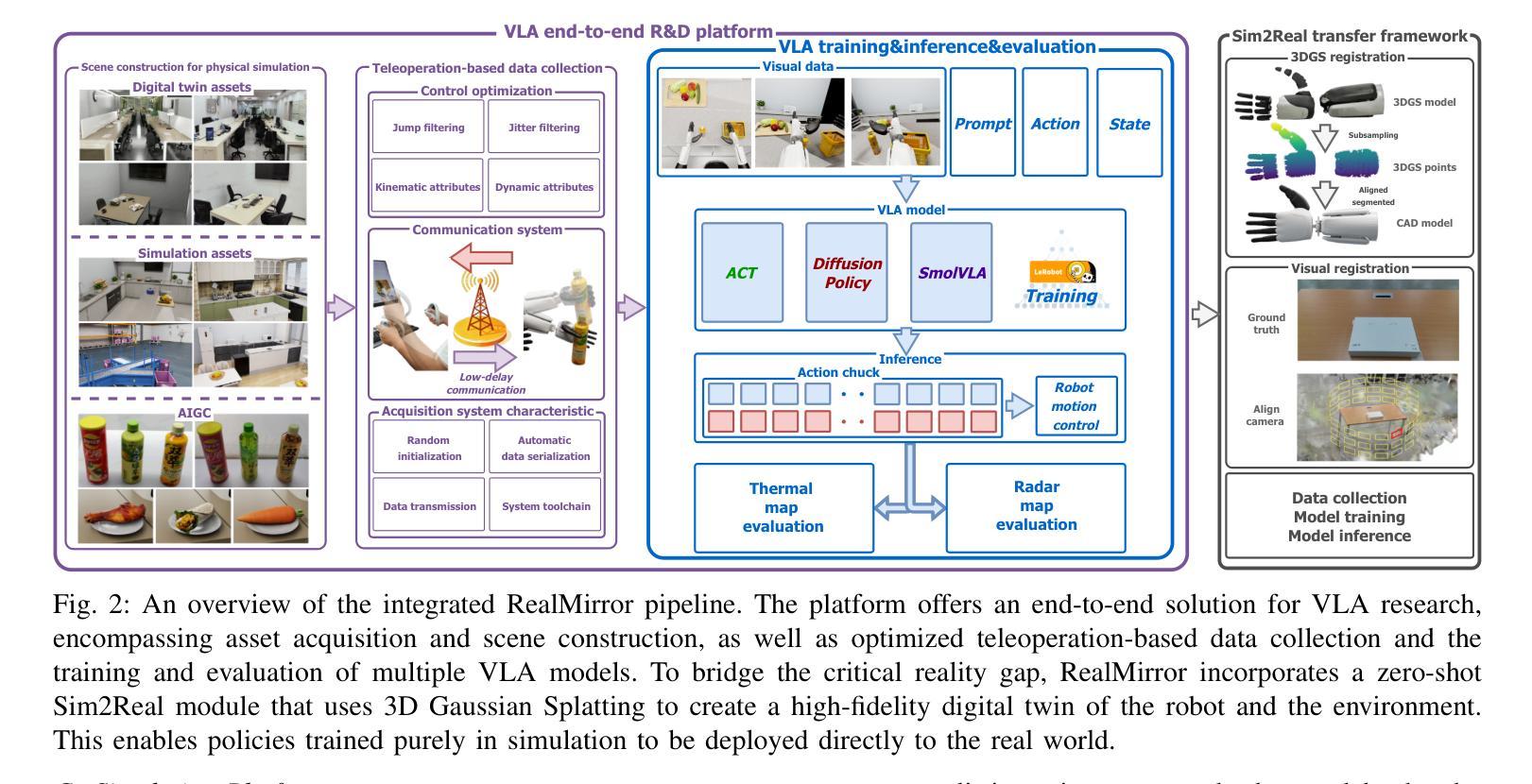 人机交互领域的视觉语言动作(VLA)新兴技术面临着多个基本挑战,包括数据采集成本高昂、缺乏标准化基准以及仿真与现实世界的巨大差距。为了克服这些障碍,我们提出了RealMirror,这是一个全面开源的实体人工智能VLA平台。RealMirror建立了一个高效低成本的数据收集、模型训练和推理系统,能在无需真实机器人的情况下实现端到端的VLA研究。为了促进模型发展和公平竞争,我们还为类人机器人推出了专门的VLA基准测试,包括多种场景、广泛的轨迹和各类VLA模型。此外,通过整合生成模型和三维高斯插值技术重建真实环境和机器人模型,我们成功实现了零次Sim2Real迁移。这意味着完全基于仿真数据训练的模型可以无缝在实际机器人上执行任务,无需进行任何微调。总之,通过这些关键组件的统一整合,RealMirror提供了一个稳健的框架,极大地加速了类人机器人的VLA模型开发。项目页面:https://terminators2025.github.io/RealMirror.github.io。