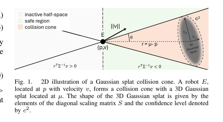 我们提出了一种感知驱动的安全过滤器,它将每个三维高斯点集(3DGS)转换为闭合形式的正向碰撞锥,进而生成嵌入二次规划(QP)中的一阶控制屏障函数(CBF)。通过利用点集的解析几何,我们的公式提供了一种连续、闭合形式的碰撞约束表示,既简单又计算高效。与基于距离的CBF不同,后者往往只在障碍物已经很接近时才发生反应,我们的碰撞锥CBF能够提前激活,使机器人能够更早地进行调整,从而在较低的计算成本下产生更平滑、更安全的避障动作。我们在一个包含大约17万个点集的大型合成场景中对该方法进行了验证,我们的过滤器将规划时间减少了三倍,并且在轨迹冲击方面与最先进的3DGS规划器相比有了显著的降低,同时保持了相同的安全水平。该方法完全解析,不需要高阶CBF扩展(HOCBFs),并且可以通过点集的Minkowski和膨胀原理自然地扩展到具有物理尺寸的机器人。这些特性使该方法广泛应用于感知派生的杂乱极端环境中的实时导航,包括空间机器人和卫星系统。
