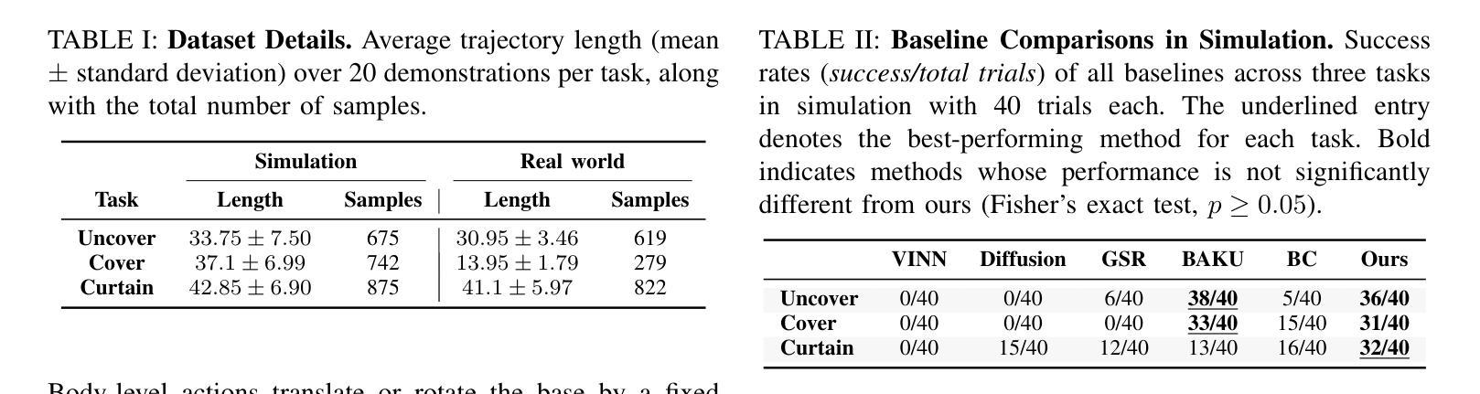 模仿学习(IL)算法通常会将经验转化为参数化的行为策略,以模仿专家演示。然而,在演示有限的情况下,现有方法往往难以生成准确的行为,特别是在部分可观察的情况下。为了解决这个问题,我们引入了一种few-shot IL方法ReMoBot,它直接从演示中检索信息,以解决使用自我中心视觉观察的移动操作任务。给定当前观察,ReMoBot利用视觉基础模型来识别与演示相关的内容,同时考虑个体观察和历史轨迹的视觉相似性。然后,运动选择策略会为机器人选择适当的命令,直到任务成功完成。ReMoBot在模拟和真实环境中对三项移动操作任务进行了评估,使用的是波士顿动力公司的Spot机器人。在模拟环境中对五种方法进行了基准测试后,我们在真实环境中将我们的方法与两个基准方法进行了比较,直接对真实世界数据集进行训练,无需模拟到真实的转移。仅凭20个演示,ReMoBot就超越了基准方法,在“表面揭开”(70%)和“缝隙覆盖”(80%)任务中取得了较高的成功率,同时在更具挑战性的“窗帘打开”任务中也表现出了有前景的性能。此外,ReMoBot展示了在不同机器人位置、物体大小和材质类型上的泛化能力。更多详细信息请访问:https://sites.google.com/view/remobot/home(链接地址为ReMoBot官网)