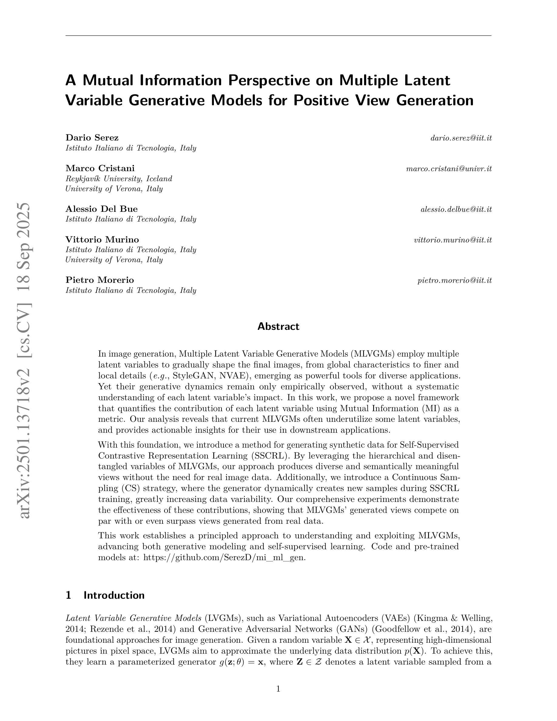 In image generation, Multiple Latent Variable Generative Models (MLVGMs) employ multiple latent variables to gradually shape the final images, from global characteristics to finer and local details (e.g., StyleGAN, NVAE), emerging as powerful tools for diverse applications. Yet their generative dynamics remain only empirically observed, without a systematic understanding of each latent variable’s impact. In this work, we propose a novel framework that quantifies the contribution of each latent variable using Mutual Information (MI) as a metric. Our analysis reveals that current MLVGMs often underutilize some latent variables, and provides actionable insights for their use in downstream applications. With this foundation, we introduce a method for generating synthetic data for Self-Supervised Contrastive Representation Learning (SSCRL). By leveraging the hierarchical and disentangled variables of MLVGMs, our approach produces diverse and semantically meaningful views without the need for real image data. Additionally, we introduce a Continuous Sampling (CS) strategy, where the generator dynamically creates new samples during SSCRL training, greatly increasing data variability. Our comprehensive experiments demonstrate the effectiveness of these contributions, showing that MLVGMs’ generated views compete on par with or even surpass views generated from real data. This work establishes a principled approach to understanding and exploiting MLVGMs, advancing both generative modeling and self-supervised learning. Code and pre-trained models at: https://github.com/SerezD/mi_ml_gen.