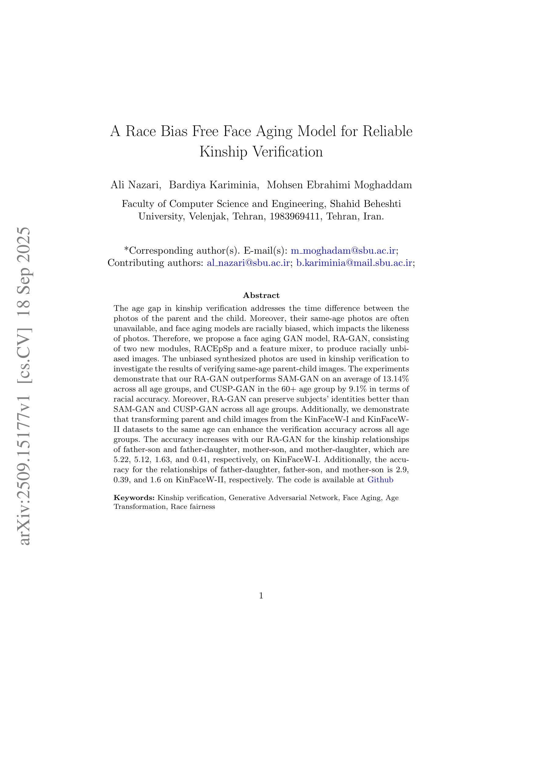 在亲属关系验证中的年龄差距主要解决了父母和孩子照片之间的时间差异问题。此外,他们的同龄照片通常不可用,并且面部衰老模型存在种族偏见,这影响了照片的真实性。因此,我们提出了一种面部衰老生成对抗网络模型(RA-GAN),它由两个新模块RACEpSp和特征混合器组成,以生成无种族偏见的图像。这些无偏的合成照片用于亲属关系验证,以验证同龄的父母与孩子的图像结果。实验表明,我们的RA-GAN在所有年龄段平均比SAM-GAN高出13.14%,在60岁以上的年龄段比CUSP-GAN高出9.1%,就种族准确性而言。此外,RA-GAN在所有年龄段中都能更好地保留主体的身份,相较于SAM-GAN和CUSP-GAN。另外,我们证明了将KinFaceW-I和KinFaceW-II数据集中的父母和孩子图像转变为相同的年龄可以提高所有年龄段的验证准确性。在KinFaceW-I上,对于父子、父女、母子、母女等亲属关系的验证准确性,随着我们RA-GAN的使用而提高,分别为5.22、5.12、1.63和0.41。此外,在KinFaceW-II上,对于父女、父子、母子的关系验证准确性分别为2.9、0.39和1.6。代码可在Github上获得:https://github.com/bardiya2254kariminia/An-Age-Transformation-whitout-racial-bias-for-Kinship-verification。