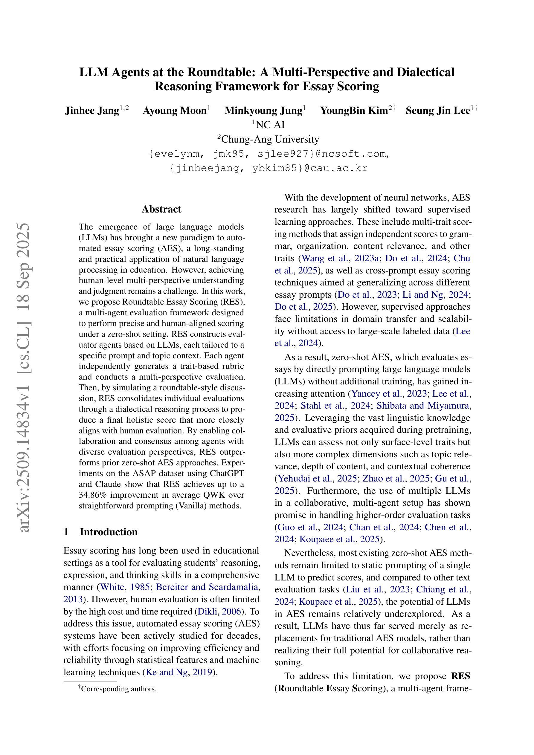 大型语言模型(LLM)的出现为自动作文评分(AES)带来了新的模式,但在零样本设置下实现人类级别多角度理解和判断仍存在挑战。本研究提出Roundtable Essay Scoring(RES)多智能体评估框架,旨在进行精确且符合人类评估的评分。RES基于LLM构建评估器智能体,每个智能体针对特定提示和主题上下文进行定制,独立生成基于特征的评分表并进行多角度评估。通过模拟圆桌讨论,RES通过辩证推理过程整合个人评估结果,产生更接近人类评价的总体评分。RES通过促进拥有不同评估角度的智能体之间的协作和共识,表现出优于先前零样本AES方法的效果。在ASAP数据集上进行的ChatGPT和Claude实验表明,RES相较于简单的提示方法平均QWK提高了高达34.86%。