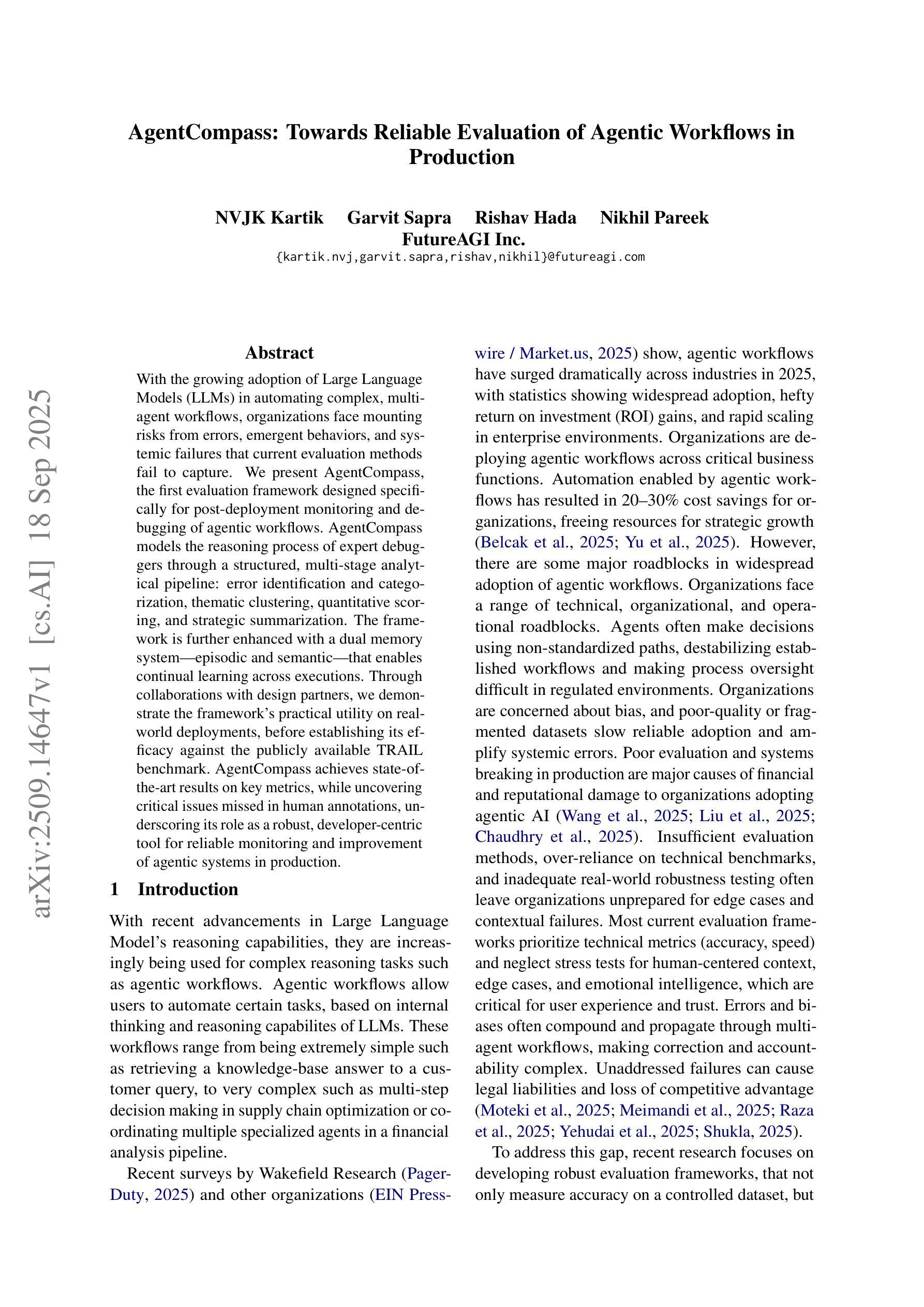 大型语言模型(LLMs)在自动化复杂、多代理工作流程中的普及,使得组织面临越来越多的风险,如错误、新兴行为和系统失效等,而现有的评估方法无法捕捉到这些风险。为此,我们推出了AgentCompass,这是专门为代理工作流程的后部署监控和调试设计的评估框架。AgentCompass通过结构化、多阶段的分析管道来模拟专家调试器的推理过程,包括错误识别和分类、主题聚类、定量评分和战略总结。该框架还采用双记忆系统——情景记忆和语义记忆,以实现跨执行的持续学习。通过与设计合作伙伴的合作,我们在实际部署中展示了该框架的实际效用,并在公开的TRAIL基准测试上验证了其有效性。AgentCompass在关键指标上达到了最新水平的结果,同时发现了人类注释中遗漏的关键问题,凸显了其在生产环境中可靠监控和改进代理系统的稳健性和面向开发者的作用。