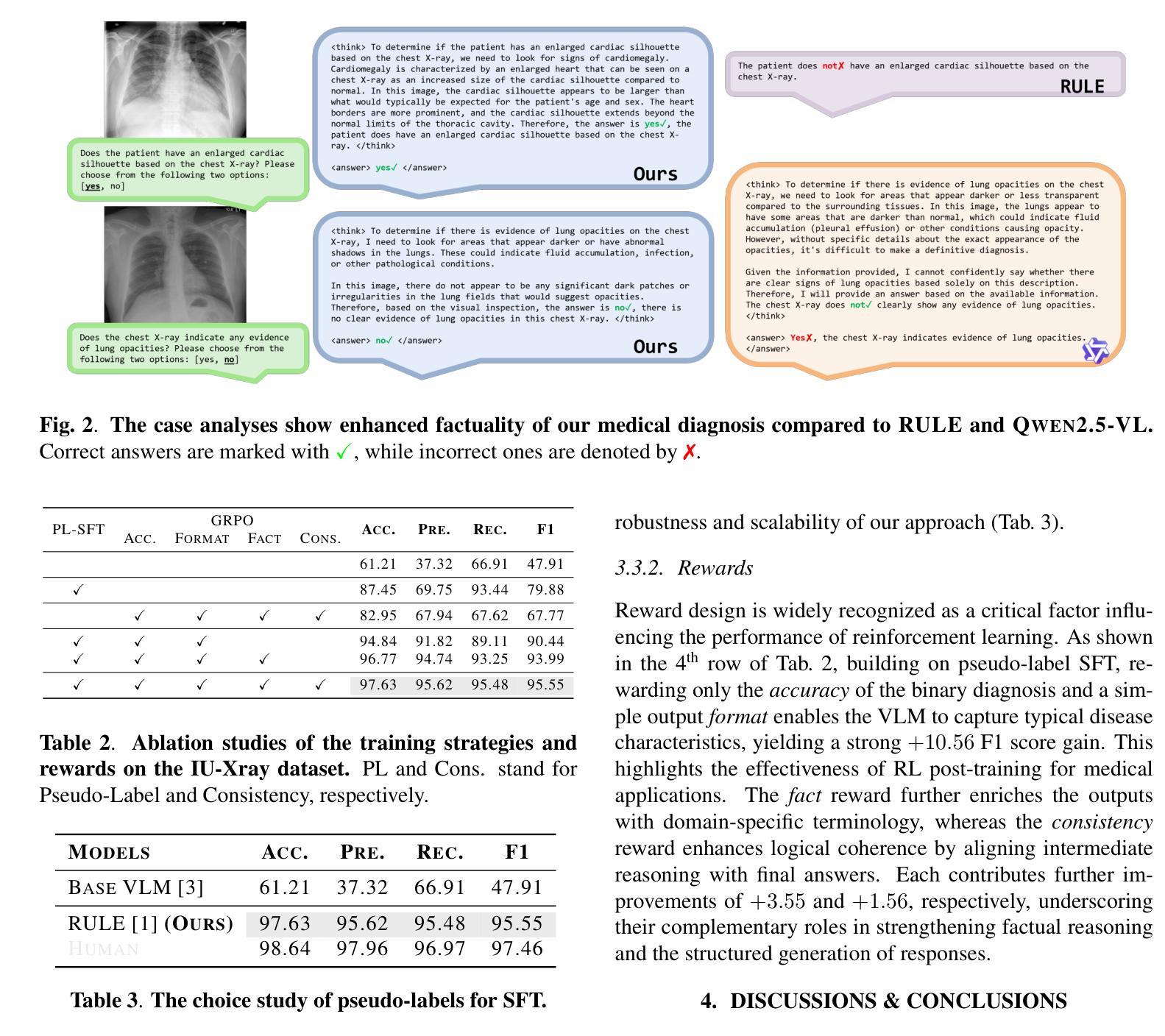 - 消融研究强调了伪标签SFT冷启动的必要性,并验证了每个GRPO奖励的贡献。