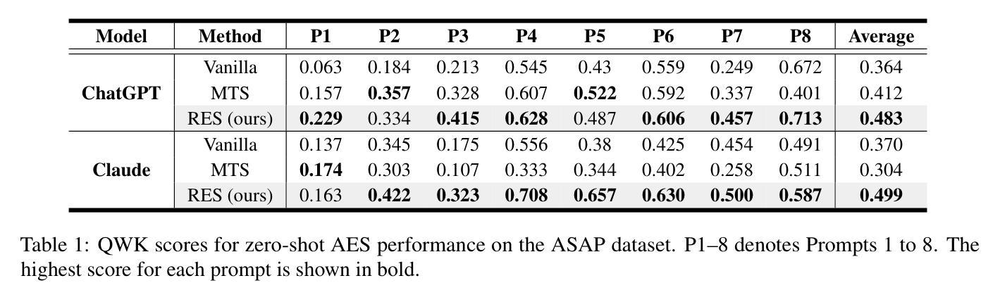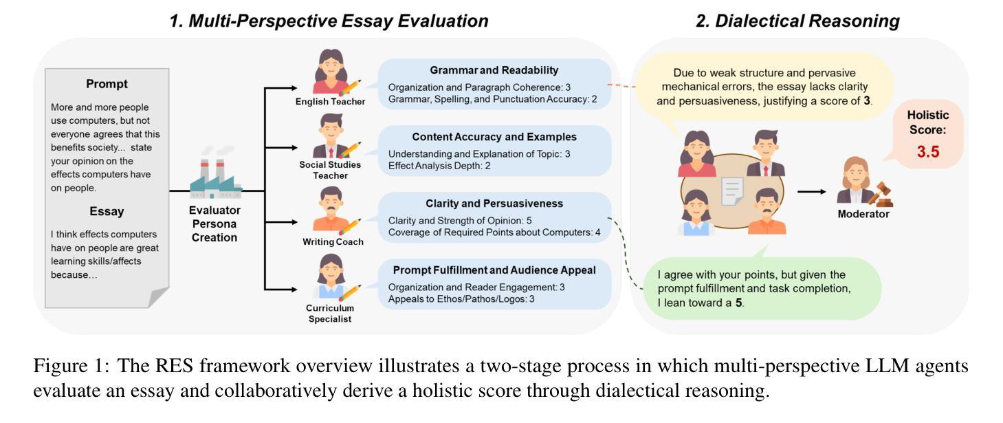 - Roundtable Essay Scoring(RES)框架模拟人类评估过程,旨在精确且符合人类评估进行评分。