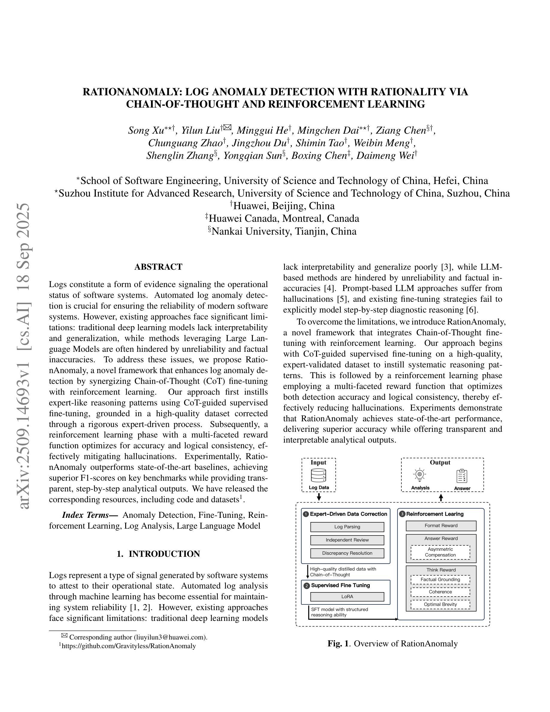 - RationAnomaly框架通过协同链式思维(CoT)精细调整与强化学习来增强日志异常检测。