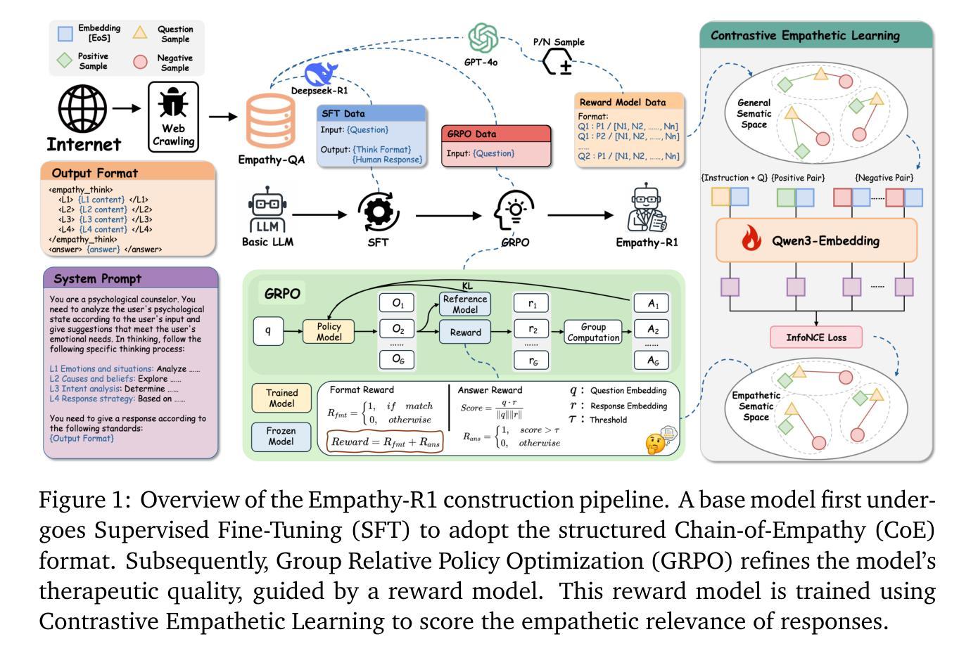 - Empathy-R1是一个新的框架,结合了情感链(CoE)推理和强化学习(RL),旨在提高针对LCTs的回应质量。