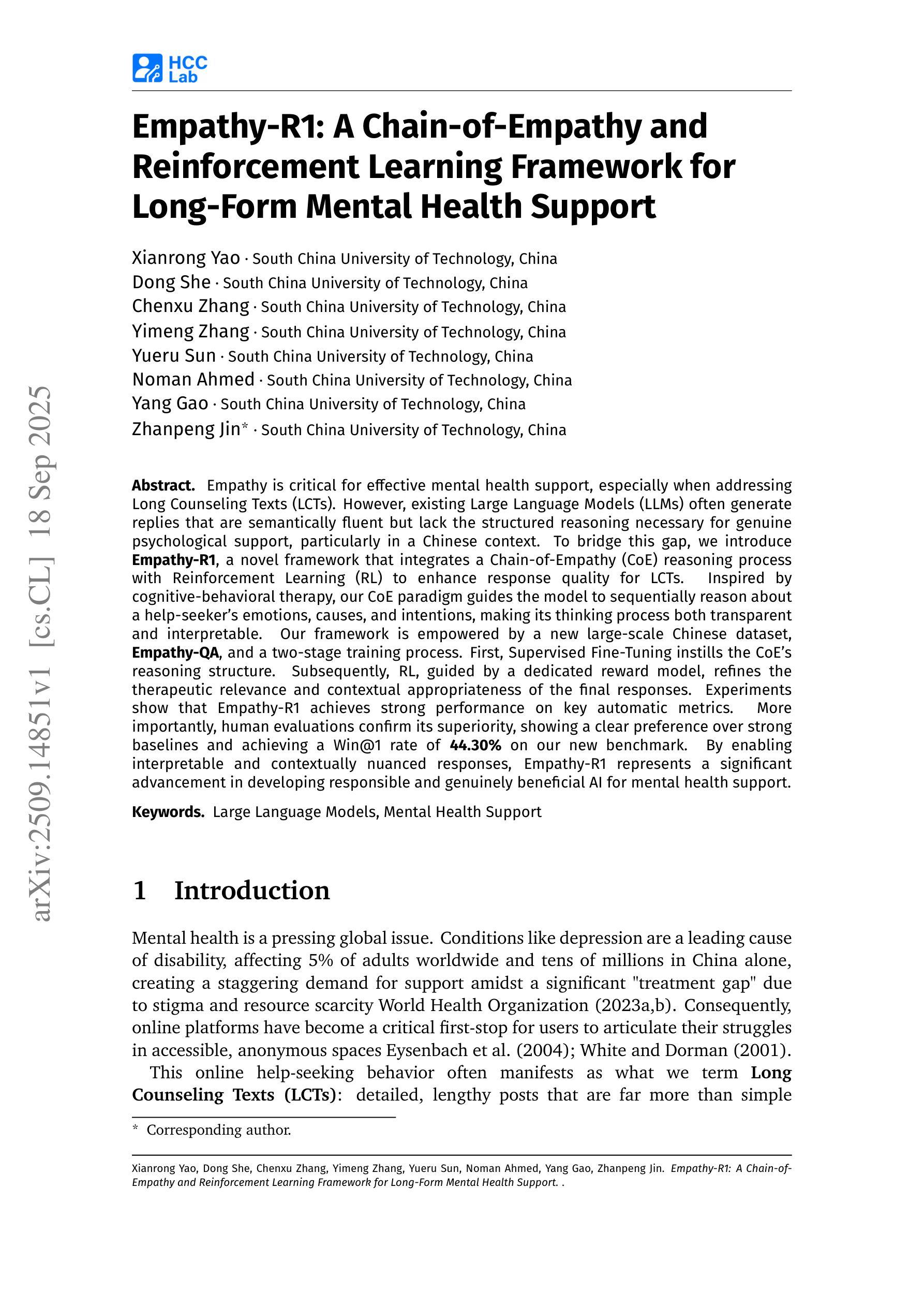 共情对于有效的心理健康支持至关重要,特别是在处理长咨询文本(LCTs)时。然而,现有的大型语言模型(LLM)通常生成的回复在语义上很流畅,但缺乏真正的心理支持所需的结构化推理,特别是在中文环境中。为了弥补这一差距,我们引入了Empathy-R1,这是一个结合共情链(CoE)推理过程与强化学习(RL)的新型框架,以提高对LCTs的回复质量。我们的CoE范式受认知行为疗法的启发,引导模型对求助者的情绪、原因和意图进行顺序推理,使其思考过程既透明又易于解释。我们的框架通过新的大规模中文数据集Empathy-QA和两阶段训练过程来实现。首先,监督微调(Supervised Fine-Tuning)灌输CoE的推理结构。随后,由专用奖励模型引导的强化学习(RL)进一步完善最终回复的治疗相关性和上下文恰当性。实验表明,Empathy-R1在关键自动指标上取得了强大的性能。更重要的是,人类评估证实了其优越性,显示出对强大基准测试有明显的偏好,并在我们的新基准测试中实现了44.30%的Win@1率。通过生成可解释且上下文丰富的回应,Empathy-R1在开发用于心理健康支持的负责任和真正有益的AI方面取得了重大进展。