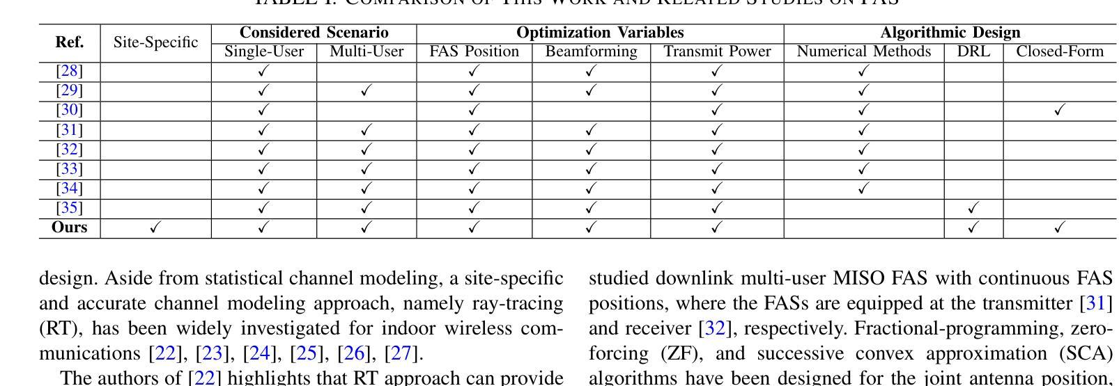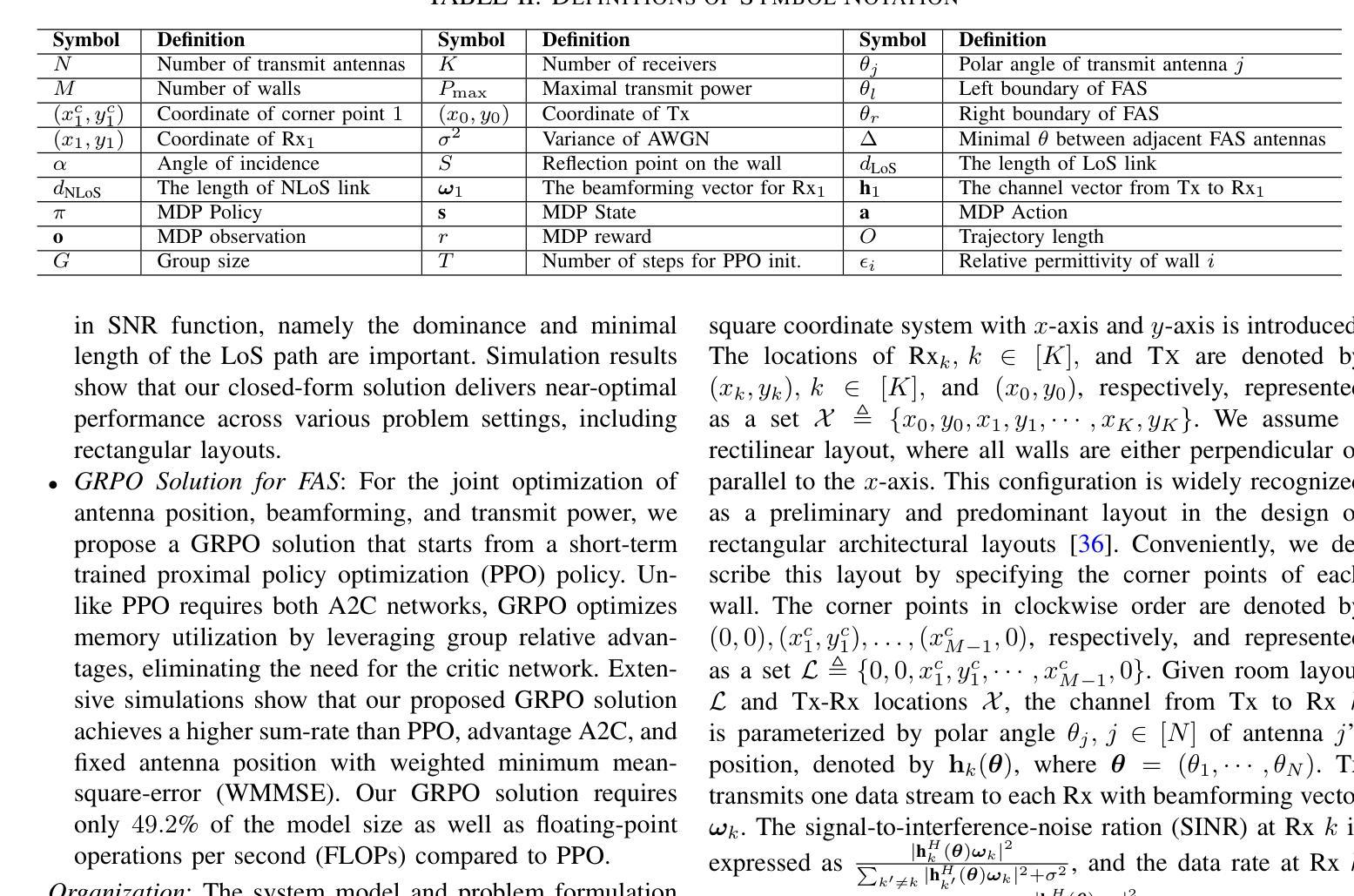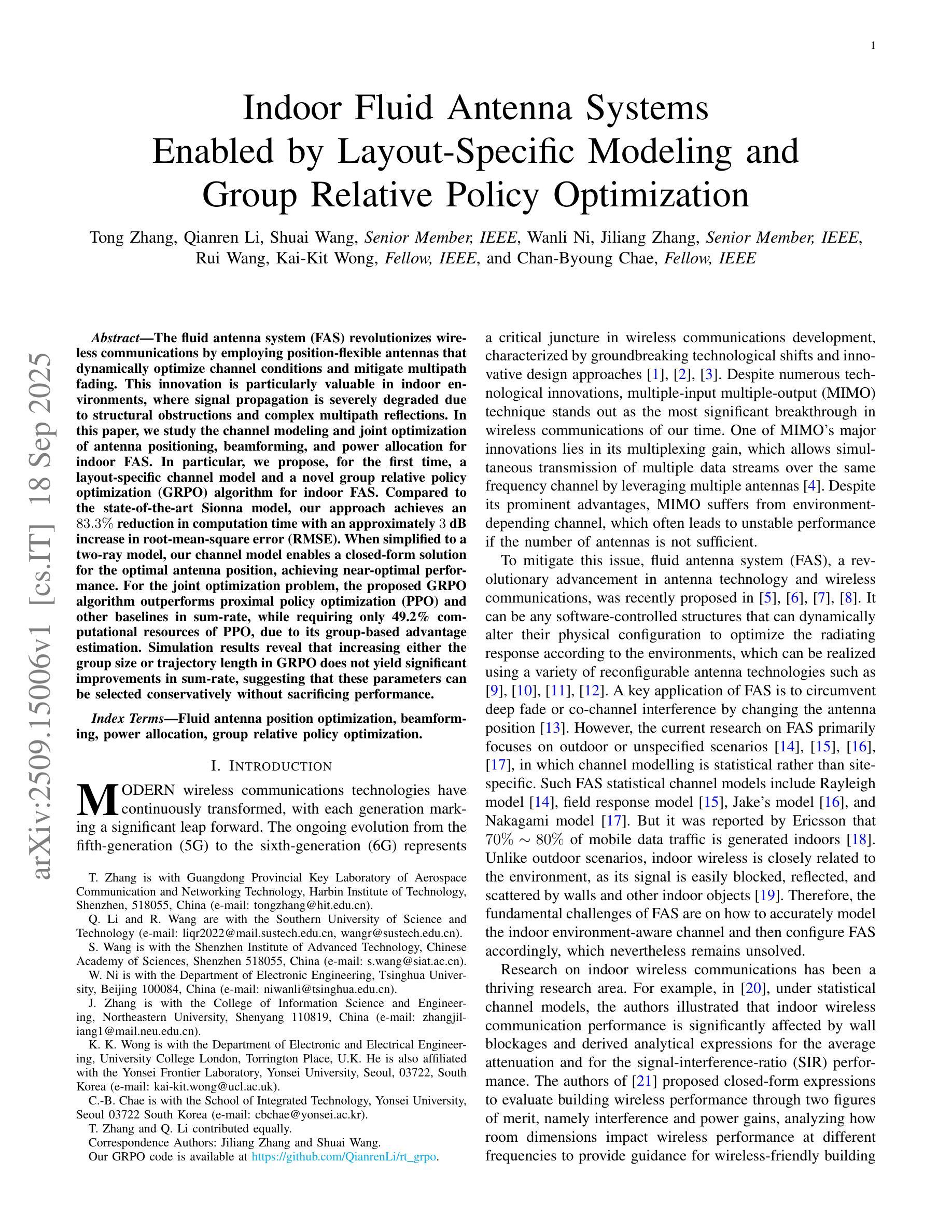 流体天线系统(FAS)通过采用动态优化信道条件并减轻多路径衰落的定位灵活天线,实现了无线通信的革命性变革。这种创新在室内部署中尤其具有价值,因为结构阻碍和复杂的多路径反射会严重削弱信号传播。在本文中,我们研究了室内FAS的信道建模以及天线定位、波束形成和功率分配的联合优化。特别是我们首次提出了针对布局的特定信道模型和用于室内FAS的新型分组相对策略优化(GRPO)算法。与最新的Sionna模型相比,我们的方法在计算时间上实现了83.3%的减少,同时均方根误差(RMSE)大约增加了3 dB。简化为两射线模型后,我们的信道模型能够对最佳天线位置提供封闭式解决方案,实现接近最佳性能。对于联合优化问题,所提出的GRPO算法在总和速率上优于近端策略优化(PPO)和其他基准线,并且只需要PPO的49.2%的计算资源,这得益于其基于分组的优势评估。仿真结果表明,在GRPO中增加群体规模或轨迹长度并不会在总和速率上产生重大改进,这表明这些参数可以在不牺牲性能的情况下保守选择。