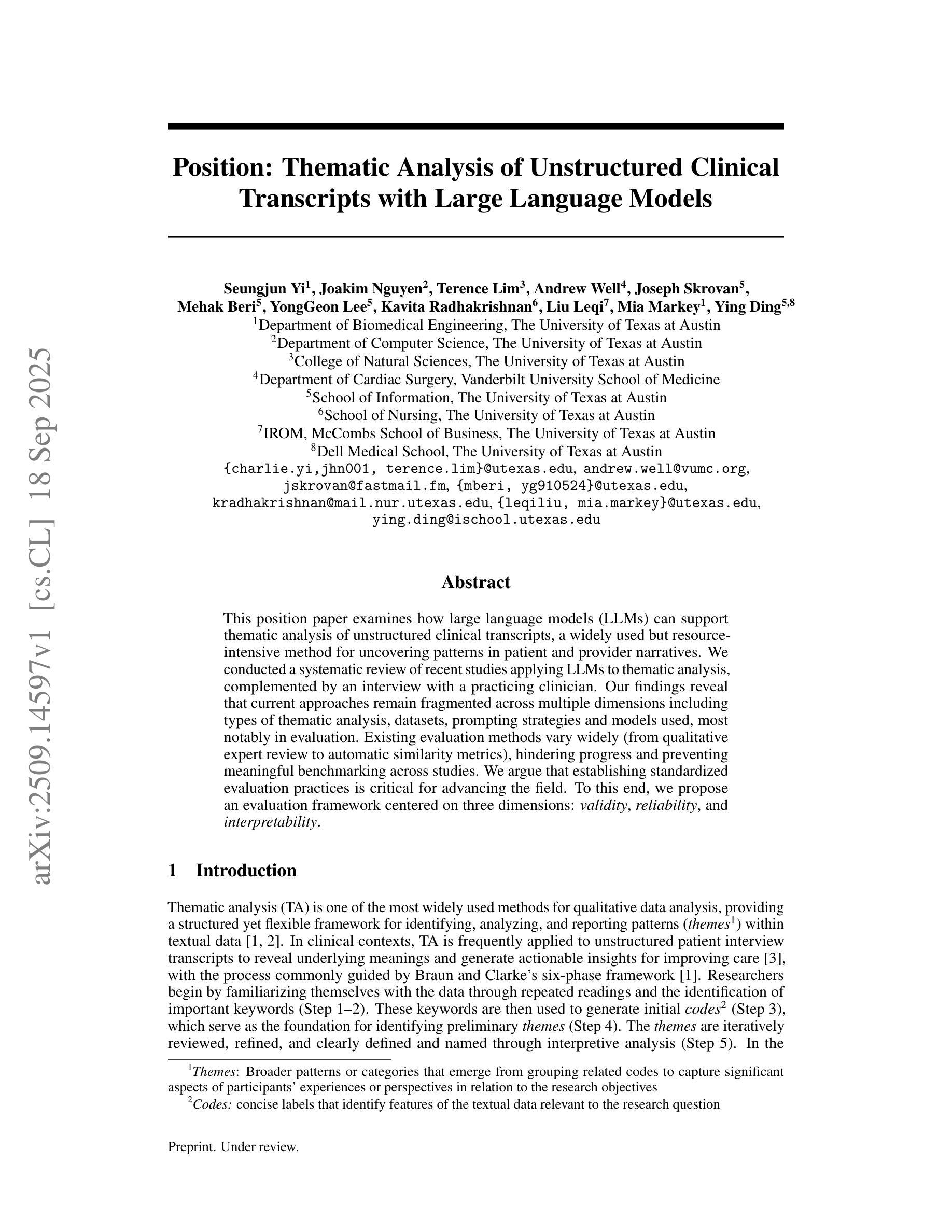 本文探讨了大型语言模型(LLMs)如何支持对临床转录进行主题分析,这是一种广泛使用但资源密集的方法,用于挖掘患者和提供者叙述中的模式。通过系统回顾近期应用LLMs进行主题分析的研究,并结合对执业医生的访谈,我们发现当前的方法在多个维度上仍然分散,最显著的是在评估方面。现有的评估方法差异很大(从定性专家评审到自动相似性度量),阻碍了进展,并阻碍了跨研究的基准测试。文章强调建立标准化的评估实践对于推动该领域的重要性,并提出一个以有效性、可靠性和可解释性为中心的评估框架。
