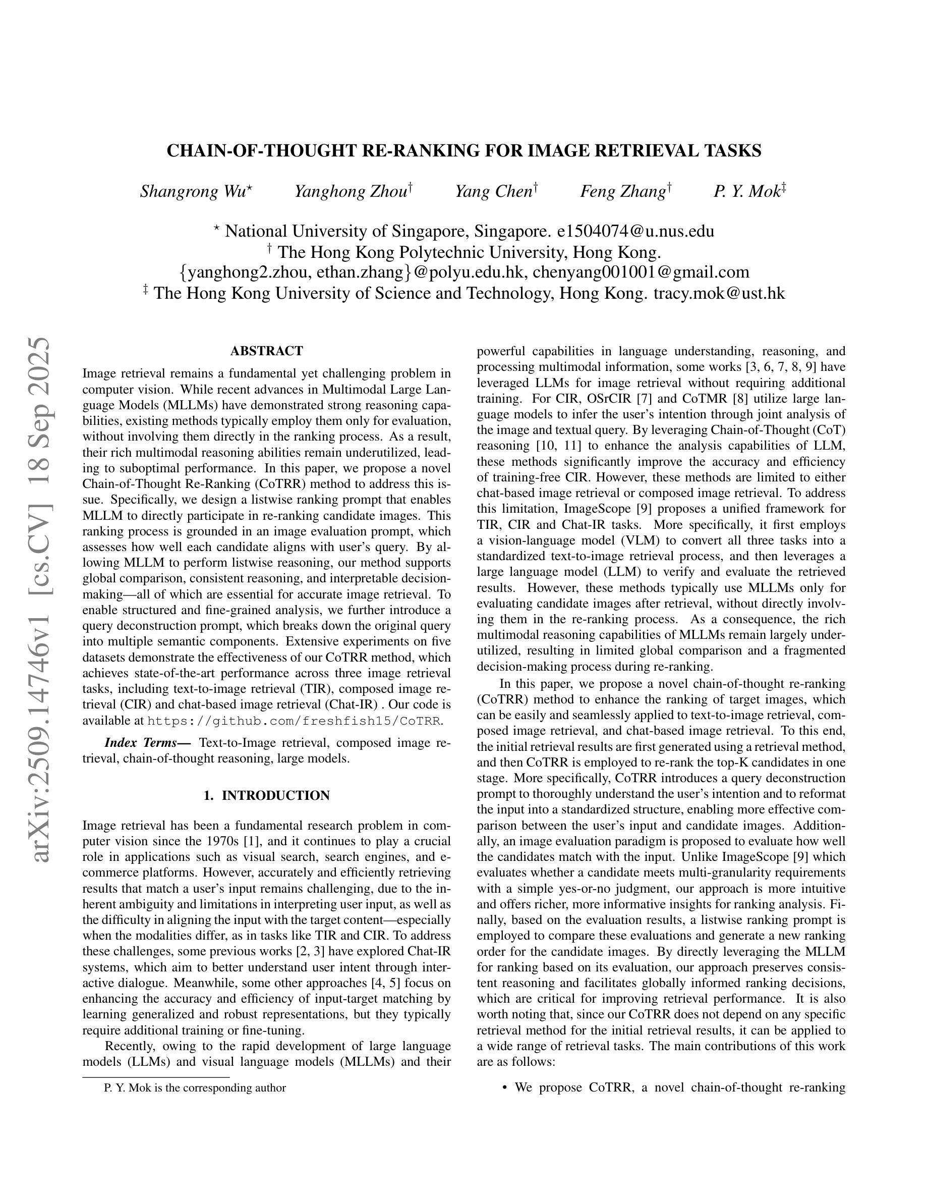 本文提出一种名为Chain-of-Thought Re-Ranking(CoTRR)的新方法,以解决图像检索中的核心挑战。该方法设计了一种列表排名提示,使多模态大型语言模型(MLLM)直接参与图像候选的重新排名过程。通过图像评估提示,评估每个候选图像与用户查询的匹配程度。该方法支持全局比较、一致推理和可解释决策制定,对于准确图像检索至关重要。引入查询解构提示,实现更精细的分析。在五个数据集上的实验表明,CoTRR方法在三种图像检索任务上达到最新水平。