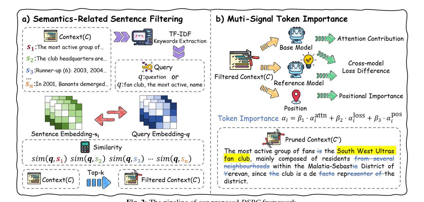- DSPC是一种两阶段、无需训练的方法,包括粗粒度的语义相关句子过滤和细粒度的标记重要性评估。