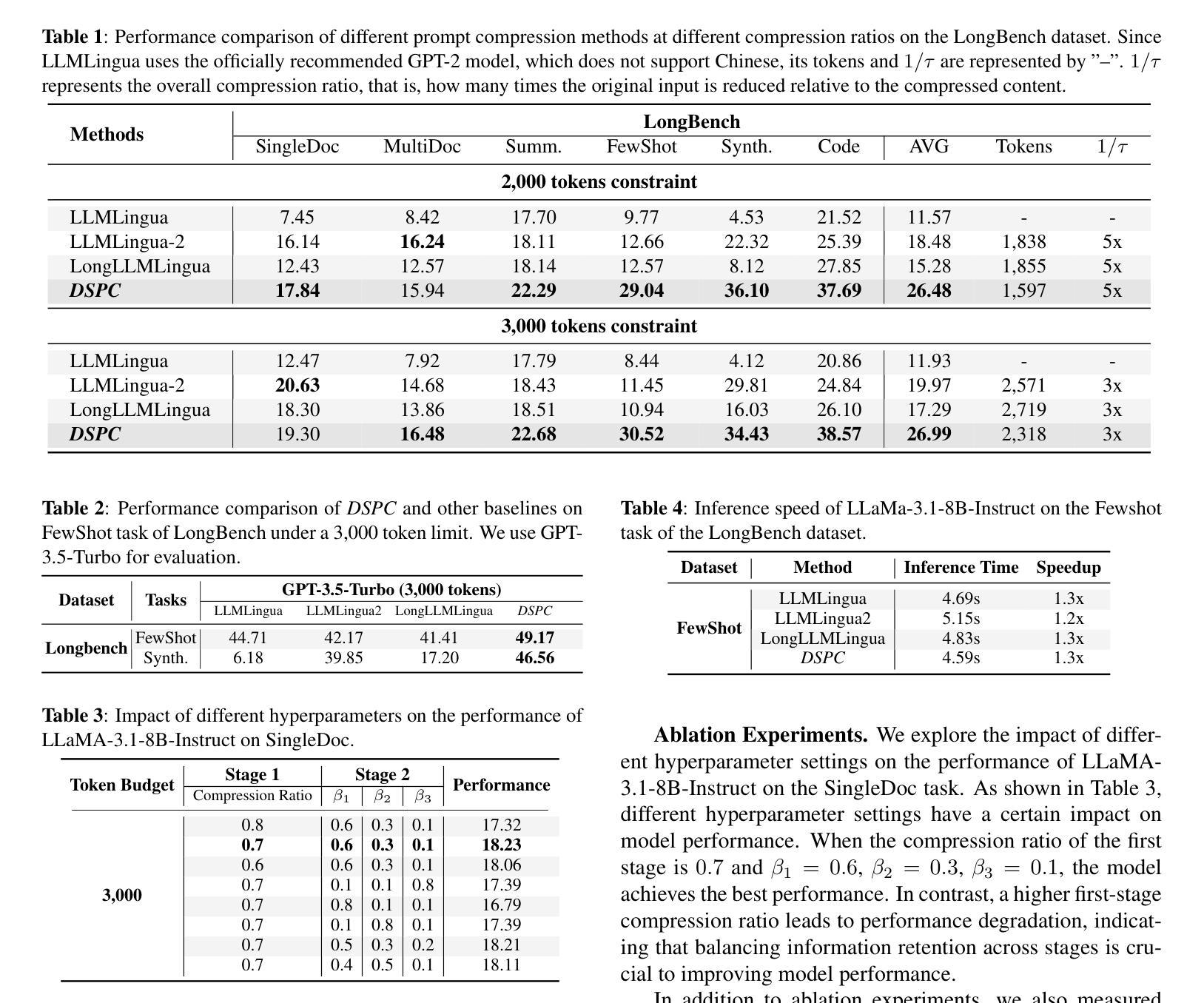 - DSPC在LLaMA和GPT模型上的实验表现优于现有最佳基线LongLLMLingua。