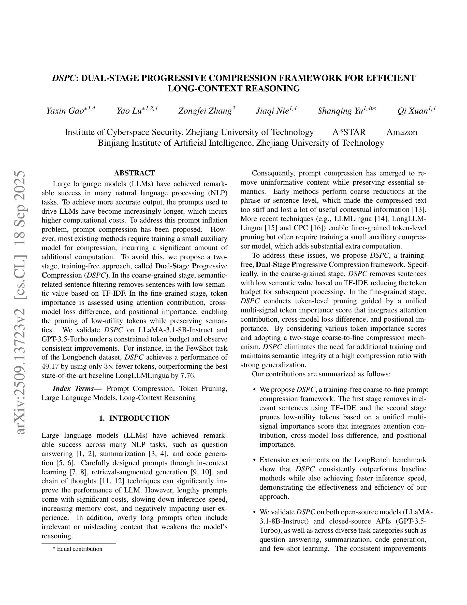 本文介绍了大型语言模型(LLMs)在NLP任务中的出色表现,但驱动LLMs的提示逐渐增长,导致更高的计算成本。为解决提示膨胀问题,本文提出了一种名为Dual-Stage Progressive Compression(DSPC)的两阶段无训练压缩方法。首先通过语义相关句子过滤去除低语义价值句子,然后评估标记的重要性,通过注意力贡献、跨模型损失差异和位置重要性来修剪低效用标记同时保留语义。在LLaMA和GPT模型上的实验表明,DSPC在有限的标记预算下实现了显著的性能提升。