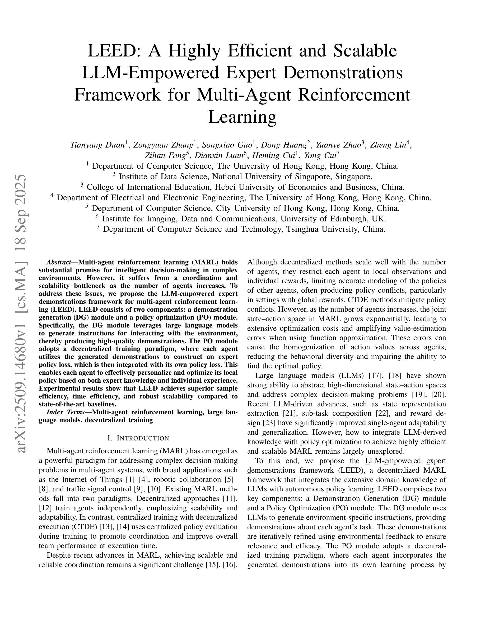 多智能体强化学习(MARL)在复杂环境中展现出智能决策的巨大潜力,但随着智能体数量的增加,协调性和可扩展性成为其瓶颈。为应对这些问题,我们提出了基于大型语言模型的专家演示框架(LEED),包括演示生成(DG)模块和政策优化(PO)模块。DG模块利用大型语言模型生成与交互环境相关的指令,从而制作高质量的演示。PO模块采用分散式训练范式,每个智能体利用生成的演示构建专家政策损失,并将其与自身政策损失结合。这使得每个智能体能够基于专家知识和个人经验有效地个性化并优化其本地策略。实验结果表明,与现有先进技术相比,LEED在样本效率、时间效率和稳健可扩展性方面表现优越。