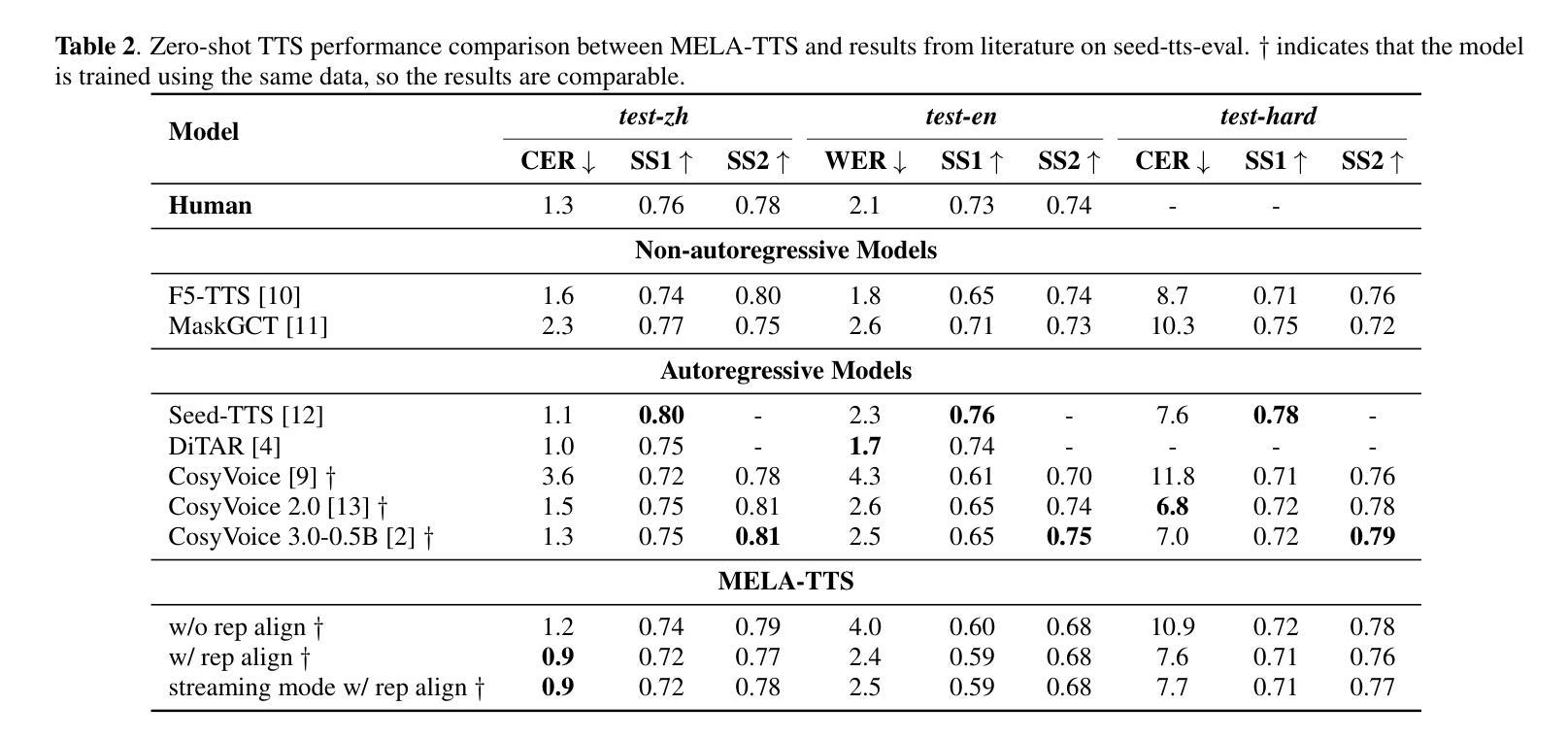 - MELA-TTS实现了多个评估指标上的先进性能。