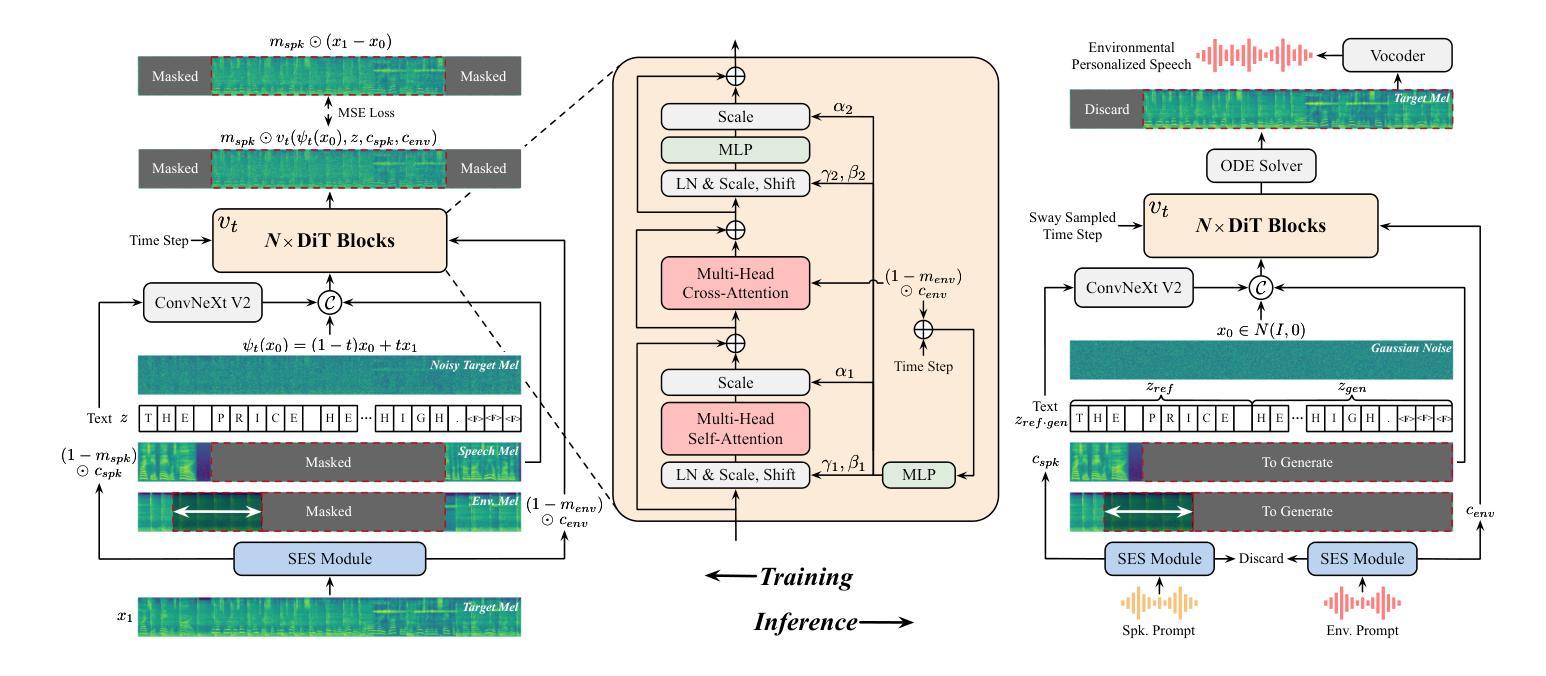 - 该框架基于F5-TTS构建,引入预训练的语音环境分离模块,将环境语音分解为纯净语音和环境音频的mel-spectrogram。