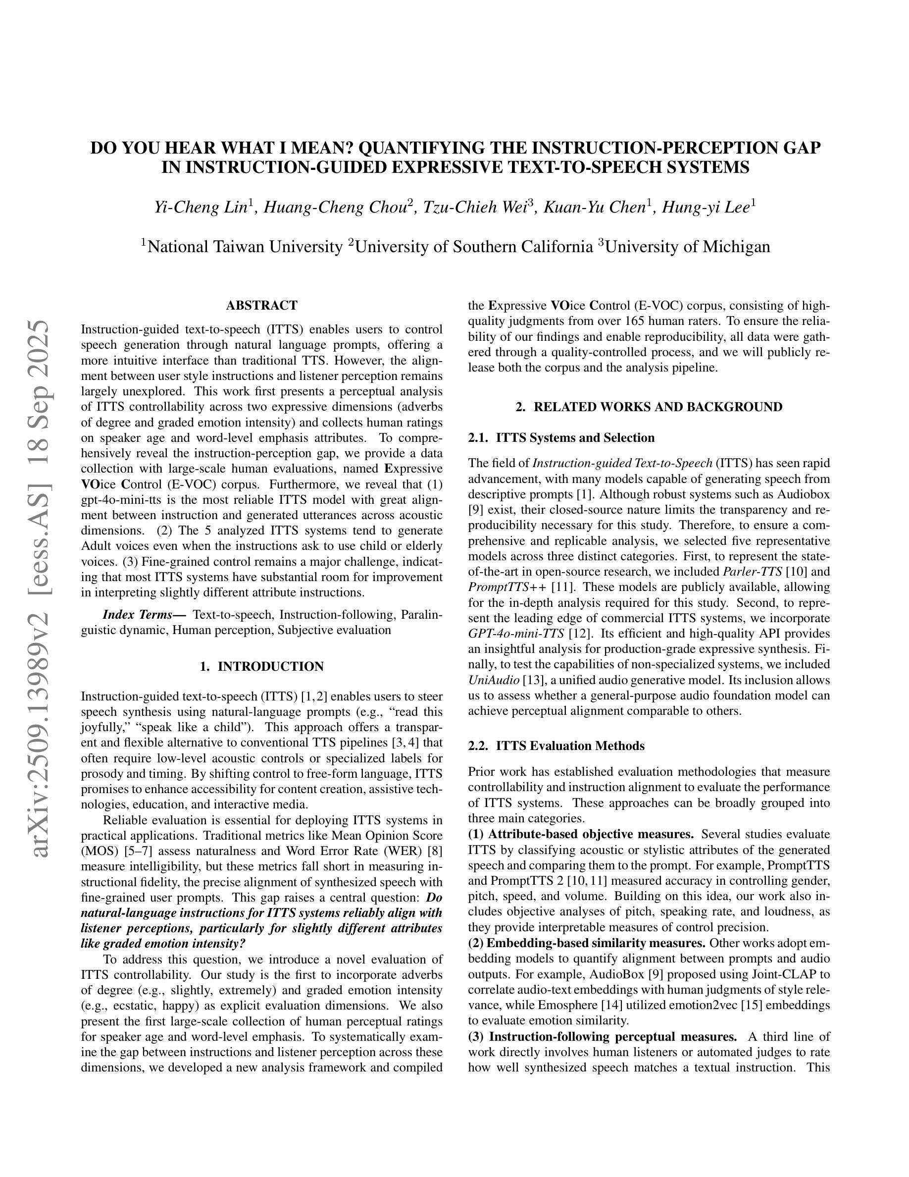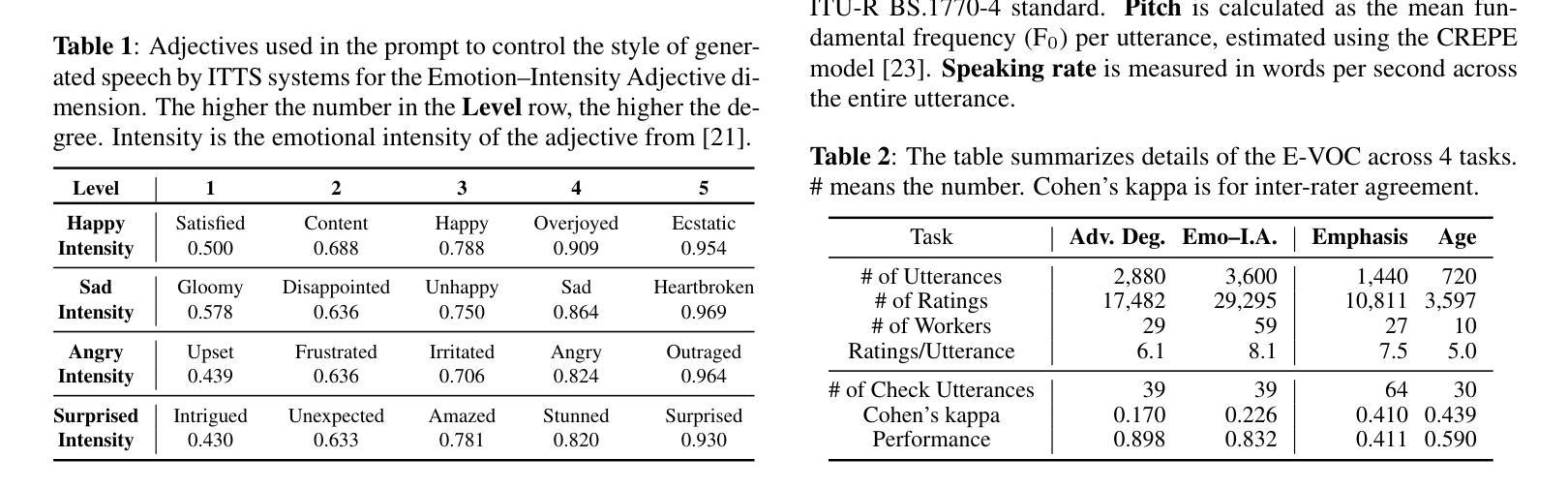 - 本研究通过感知分析探讨ITTS在表达维度上的可控性,并收集关于说话人年龄和单词强调属性的人类评分。