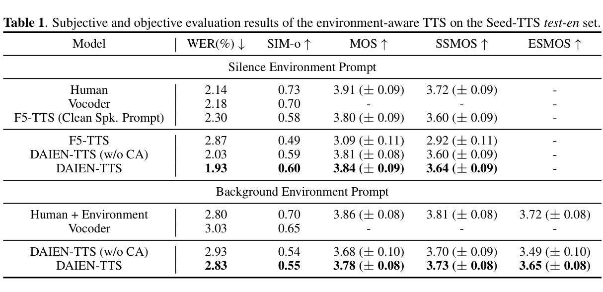 - 实验结果表明,DAIEN-TTS能生成具有高度自然性、强说话人相似性和高环境保真度的环境个性化语音。