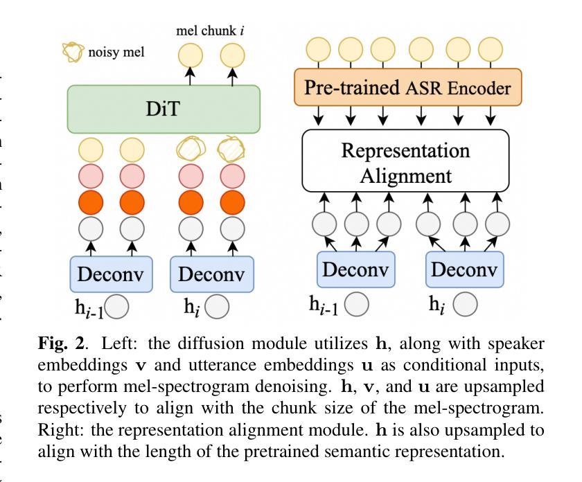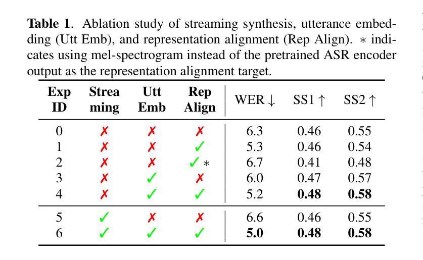 - 提出了一个表示对齐模块,该模块在训练期间将输出表示与预训练ASR编码器的语义嵌入进行对齐,提高了跨模态一致性并加快了训练收敛速度。
