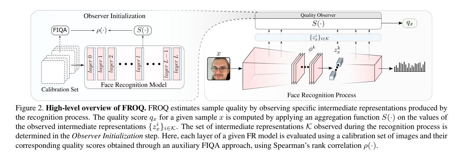 人脸识别(FR)在许多关键(高风险)应用中扮演着至关重要的角色,识别过程中的错误可能会导致严重的后果。人脸图像质量评估(FIQA)技术通过提供人脸样本的质量估计,增强了FR系统的性能,使系统能够丢弃那些不适合可靠识别或导致低置信度识别决策的样本。大多数最先进的FIQA技术依赖于广泛的监督训练来实现准确的质量估计。相比之下,无监督技术消除了对额外训练的需求,但往往速度较慢,通常表现较差。在本文中,我们介绍了FROQ(人脸识别质量观察者),这是一种半监督、无需训练的方法,它利用给定FR模型中的特定中间表示来估计人脸图像质量,结合了监督FIQA模型的效率和无监督方法的无需训练的方法。基于伪质量标签的简单校准步骤允许FROQ在任何现代FR模型中揭示对质量评估有用的特定表示。为了生成这些伪标签,我们提出了一种基于样本扰动的新型无监督FIQA技术。使用四种最先进的FR模型和八个基准数据集进行的综合实验表明,FROQ与最新技术相比取得了极具竞争力的结果,在强大性能和高效运行时间方面取得了成就,而无需明确的训练。