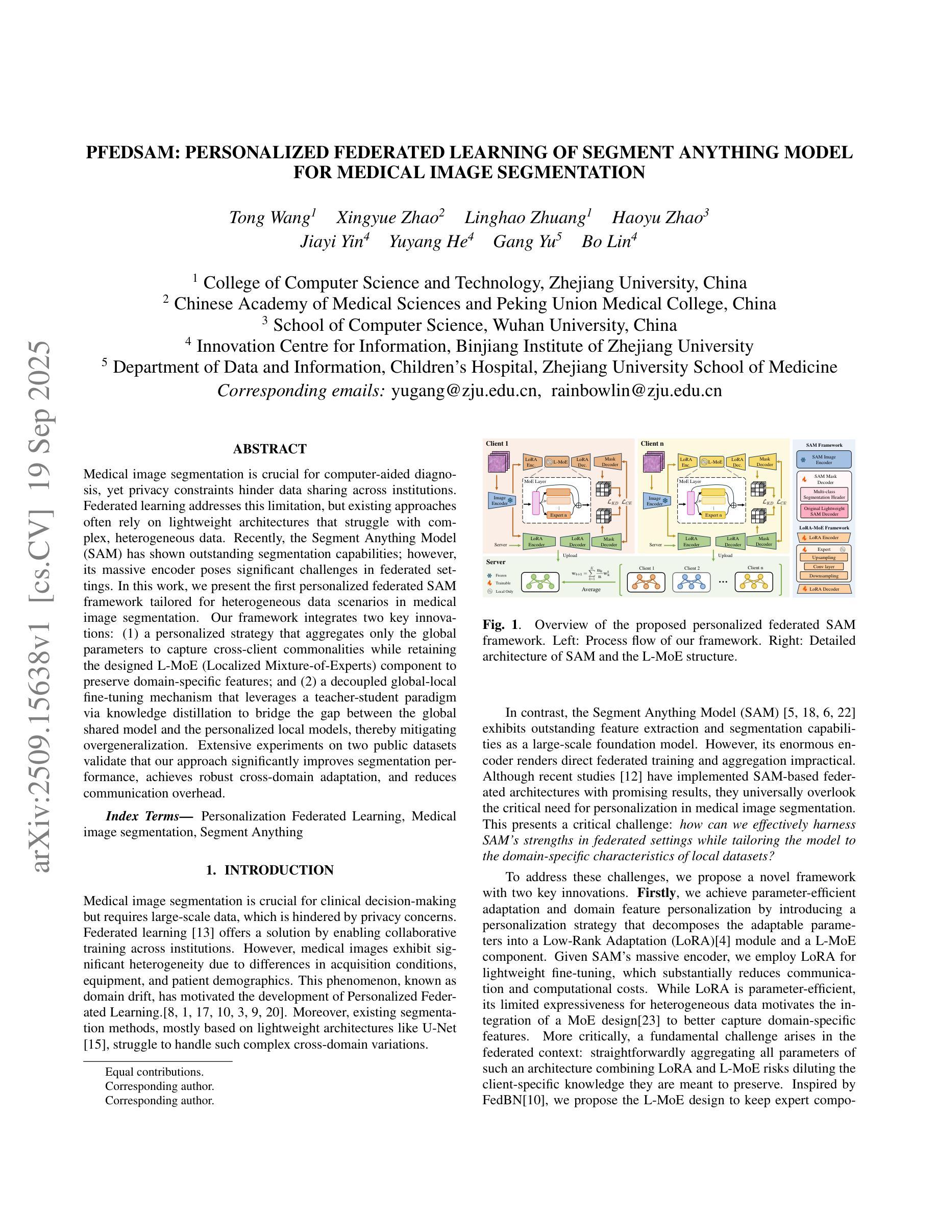 医学图像分割对于计算机辅助诊断至关重要,但隐私约束限制了跨机构的数据共享。联邦学习解决了这一局限性,但现有方法通常依赖于处理复杂、异构数据方面的轻型架构。最近,Segment Anything Model(SAM)展现出出色的分割能力,但其庞大的编码器在联邦设置中构成挑战。本研究首次提出针对医学图像分割中异构数据场景的个性化联邦SAM框架。该框架集成两项关键创新:一是仅聚合全局参数的个性化策略,以捕捉跨客户端的共性并保留设计的L-MoE(局部混合专家)组件以保留领域特定特征;二是采用解耦的全局-局部微调机制,通过知识蒸馏的教师-学生范式缩小全局共享模型和个性化本地模型之间的差距,从而缓解过度泛化问题。在公共数据集上的大量实验验证,该方法显著提高分割性能,实现稳健的跨域适应,并减少通信开销。