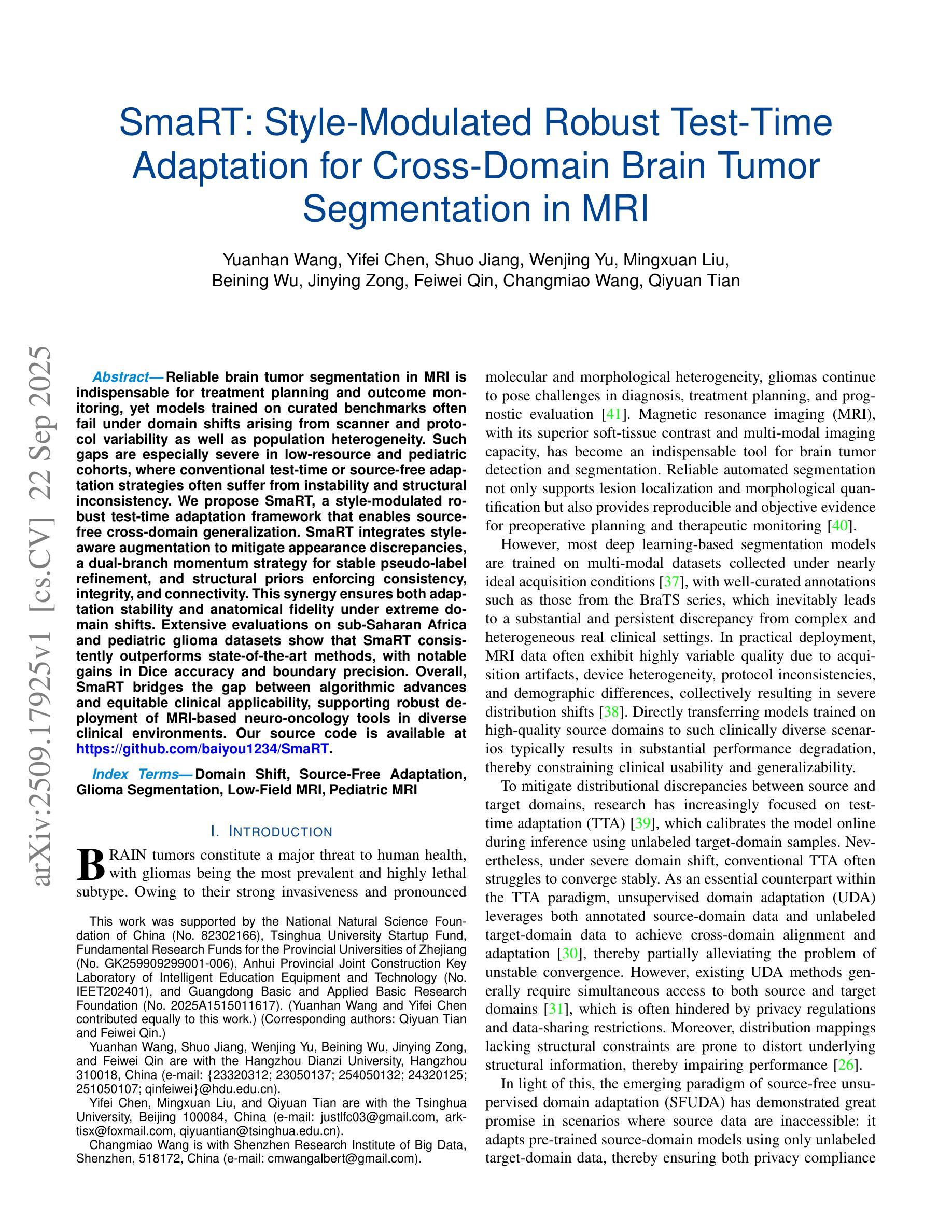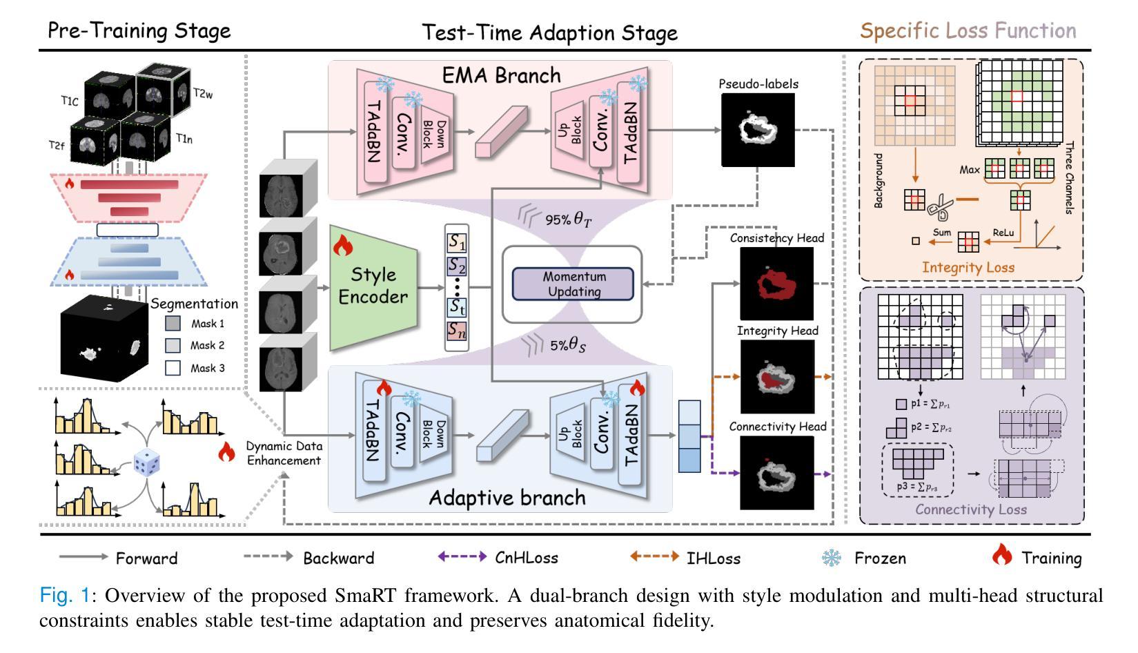 本文提出一种名为SmaRT的风格调制稳健测试时间自适应框架,实现了无源的跨域泛化能力。通过集成风格感知增强、双分支动量策略和结构性先验知识,确保在极端域转移下的适应性和解剖学保真度。在撒哈拉以南非洲和儿科胶质瘤数据集上的广泛评估表明,SmaRT在狄氏精度和边界精度方面表现优异,成功缩小了算法进步与公平临床应用之间的差距,支持MRI神经肿瘤学工具在不同临床环境中的稳健部署。