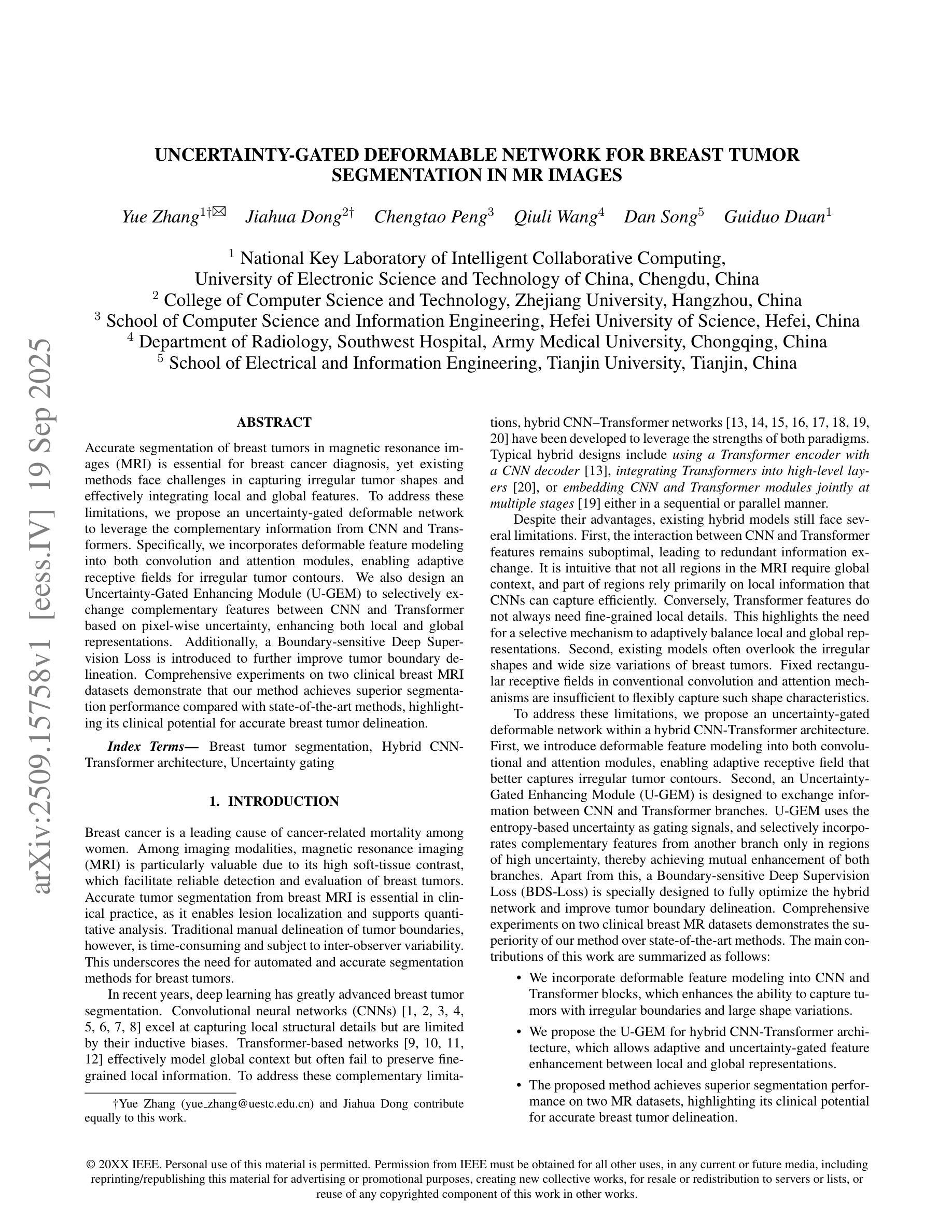 医学磁共振成像中乳腺癌肿瘤的精确分割对诊断至关重要。现有方法面临捕捉肿瘤不规则形状和有效整合局部与全局特征的挑战。为此,我们提出一种不确定性门控可变形网络,结合卷积神经网络(CNN)和Transformer的互补信息。通过引入可变形特征建模和不确定性门控增强模块(U-GEM),该网络可自适应地处理不规则肿瘤边界,同时增强局部和全局特征表示。此外,我们还引入了边界敏感深度监督损失,以进一步提高肿瘤边界的描绘效果。在多个临床乳腺MRI数据集上的实验表明,我们的方法相较于其他前沿技术,具有更出色的分割性能,显示出其在准确描绘乳腺癌肿瘤方面的临床潜力。