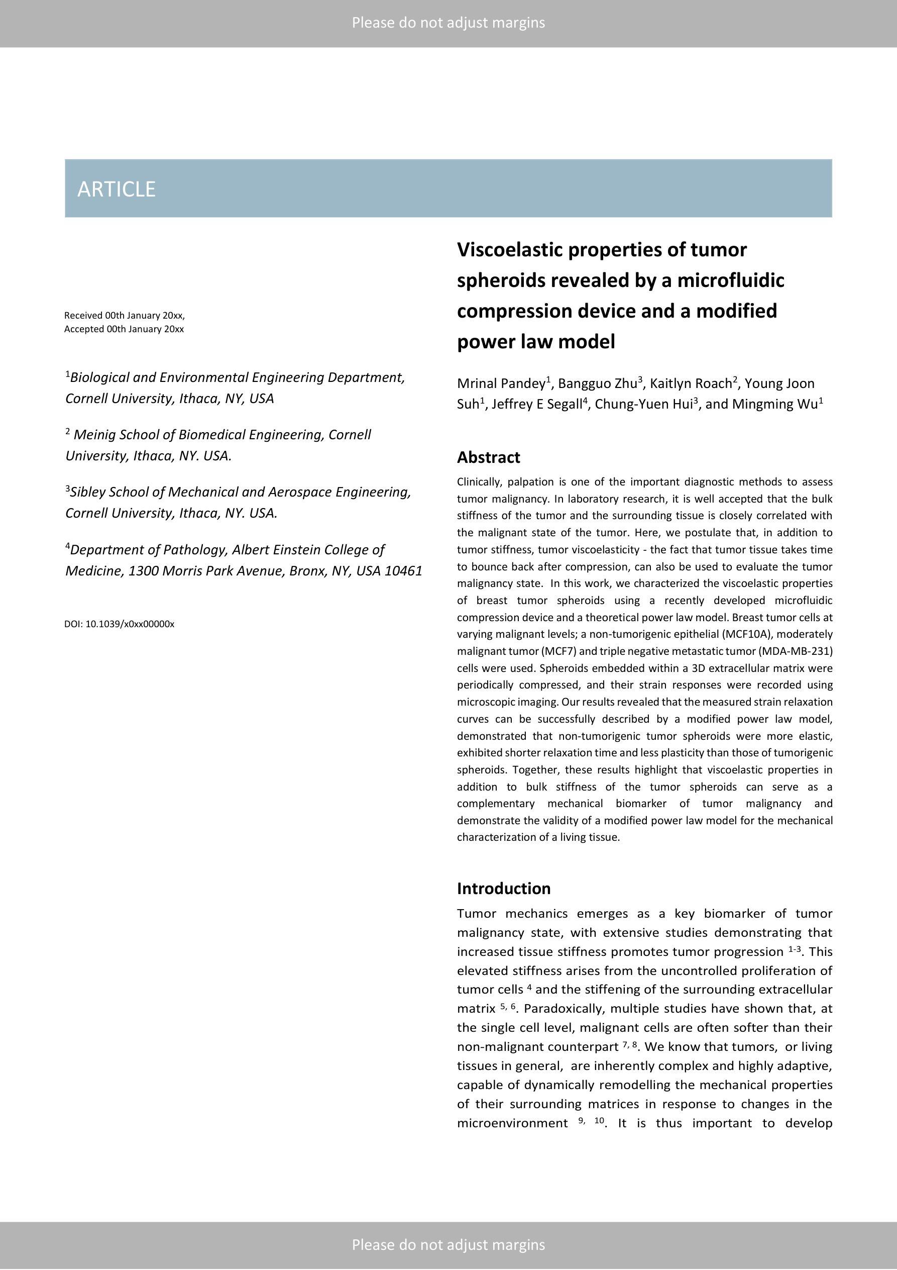 本研究探讨了肿瘤球体的粘弹性特性与肿瘤恶性程度的关系。利用微流体压缩装置和理论幂律模型,对三种不同恶性程度的乳腺肿瘤细胞进行三维基质内球体压缩实验,并记录应变响应。研究发现非肿瘤性球体较有弹性,松驰时间较短且可塑性较低;恶性肿瘤球体则展现出更粘弹性质地。这些结果表明,肿瘤球体的粘弹性特性可作为肿瘤恶性程度的辅助机械生物标志物,同时验证了改进后的幂律模型在活组织机械特性表征中的有效性。