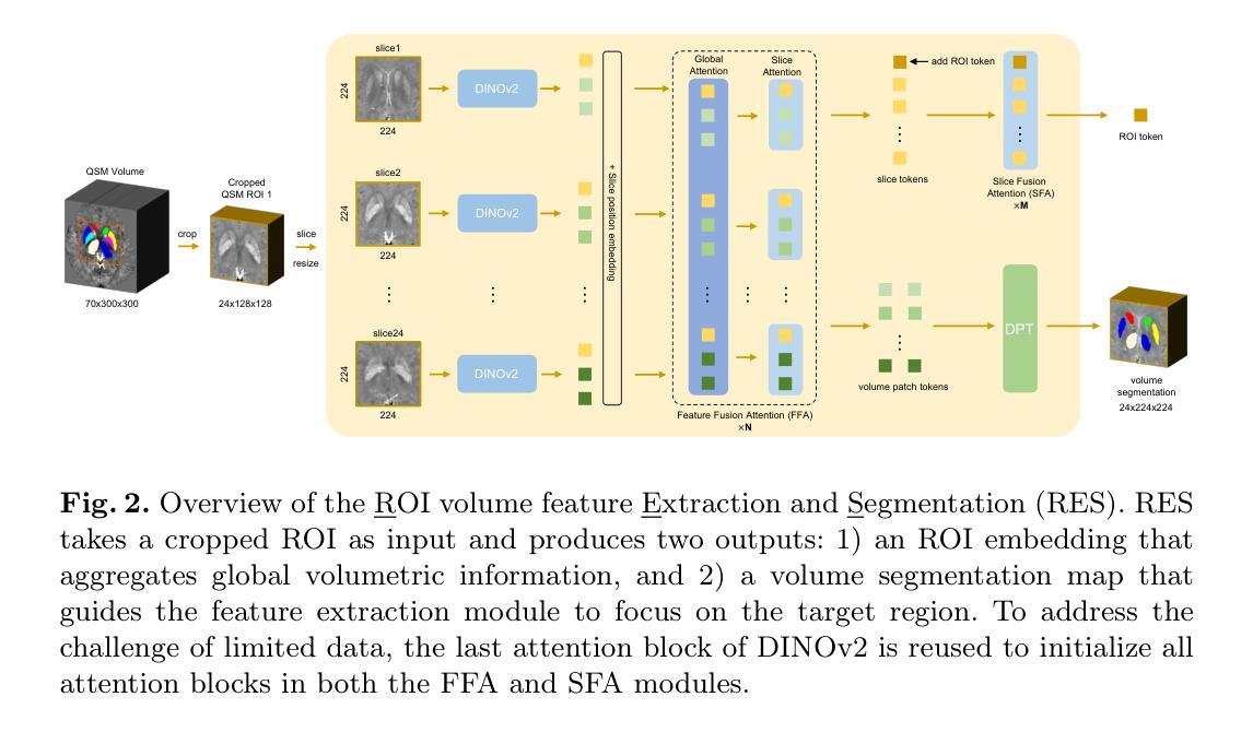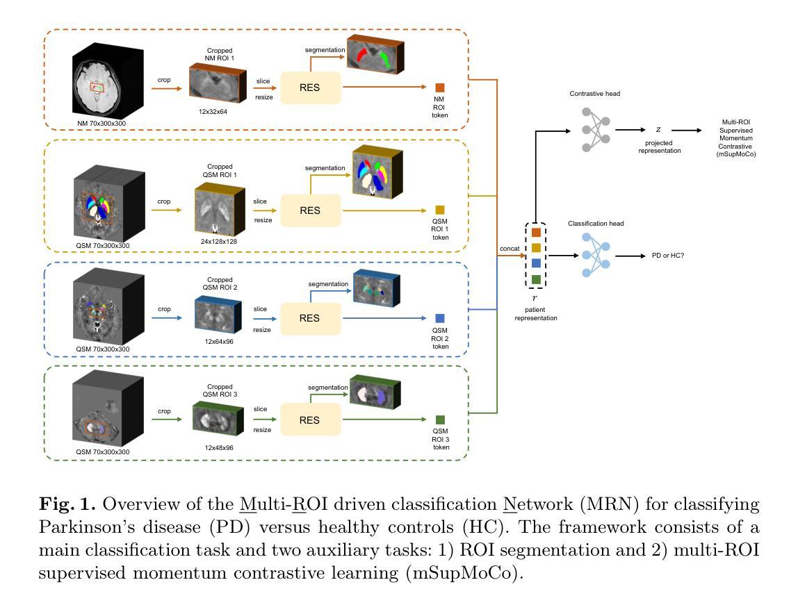 在本文中,我们通过利用二维视觉基础模型(VFMs)来解决这些挑战。具体来说,我们从NM和QSM图像中裁剪多个关键ROI,通过单独的分支处理每个ROI,将其压缩为令牌,然后将这些令牌组合成统一的患者表示进行分类。在每个分支中,我们使用二维VFMs对三维ROI体积的轴向切片进行编码,并将其融合到ROI令牌中,由辅助分割头引导,该分割头将特征提取引导至特定的脑核。此外,我们引入了多ROI监督对比学习,通过拉近同一类别患者的表示并推开不同类别患者的表示,提高了诊断性能。