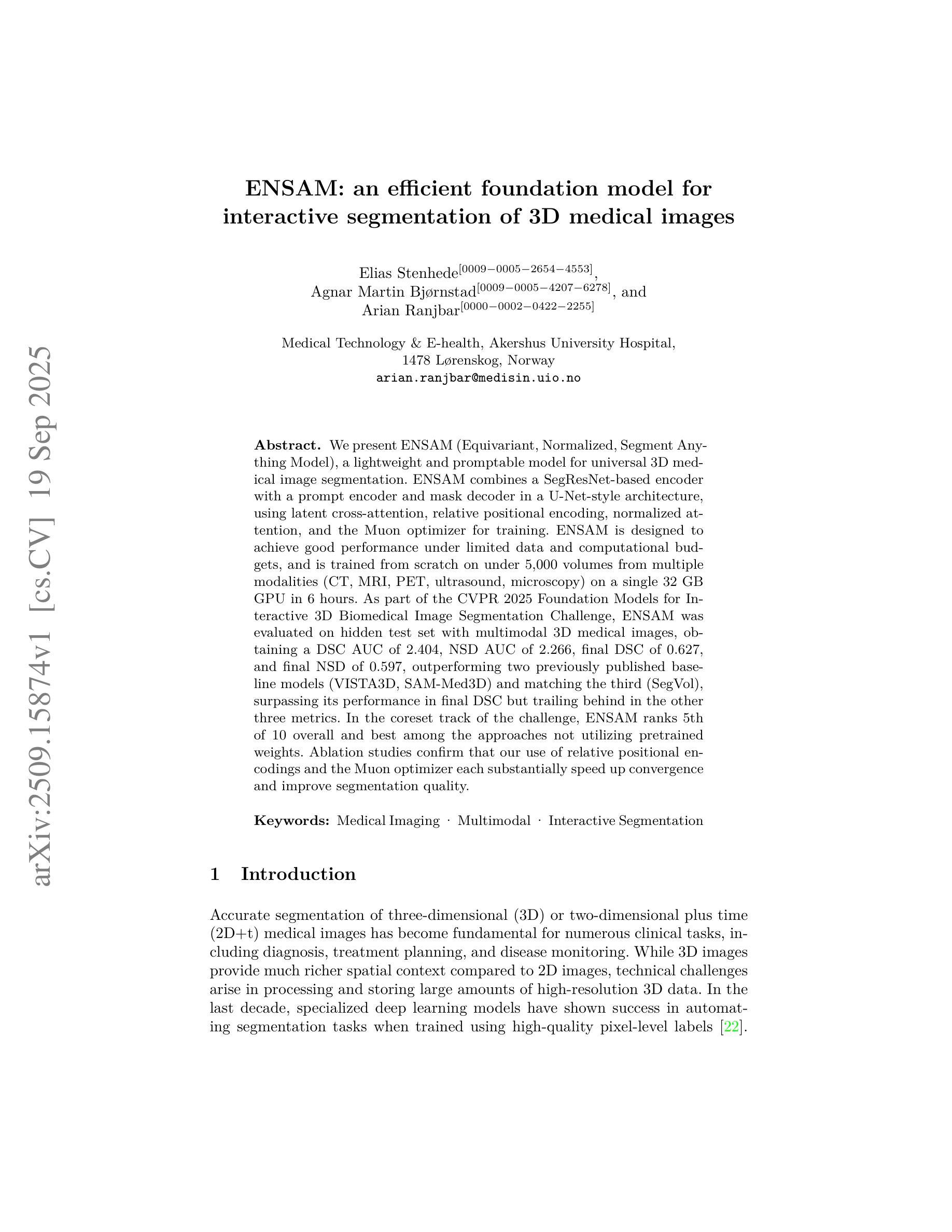 本文介绍了ENSAM模型,这是一种用于通用3D医学图像分割的轻便、快速响应的模型。ENSAM结合SegResNet编码器、提示编码器和掩膜解码器,采用U-Net风格的架构,并利用潜在交叉注意力、相对位置编码、归一化注意力和Muon优化器进行训练。ENSAM旨在实现在有限数据和计算预算下实现良好性能,在单个32GB GPU上,使用多种模态(CT、MRI、PET、超声、显微镜)在不到5,000个体积的数据集上进行训练只需6小时。在CVPR 2025交互式3D生物医学图像分割挑战的基础模型评估中,ENSAM在隐藏测试集上进行多模态3D医学图像评估,获得了DSC AUC为2.404等评价指标,相较于先前发表的两个基线模型(VISTA3D、SAM-Med3D)表现更佳,并匹配了第三名SegVol的性能,在最终DSC上表现超越SegVol但在其他三个指标上稍逊一筹。在挑战的核心集赛道中,ENSAM位列第五名。消融研究证实,我们使用的相对位置编码和Muon优化器分别显著加快了收敛速度并提高了分割质量。